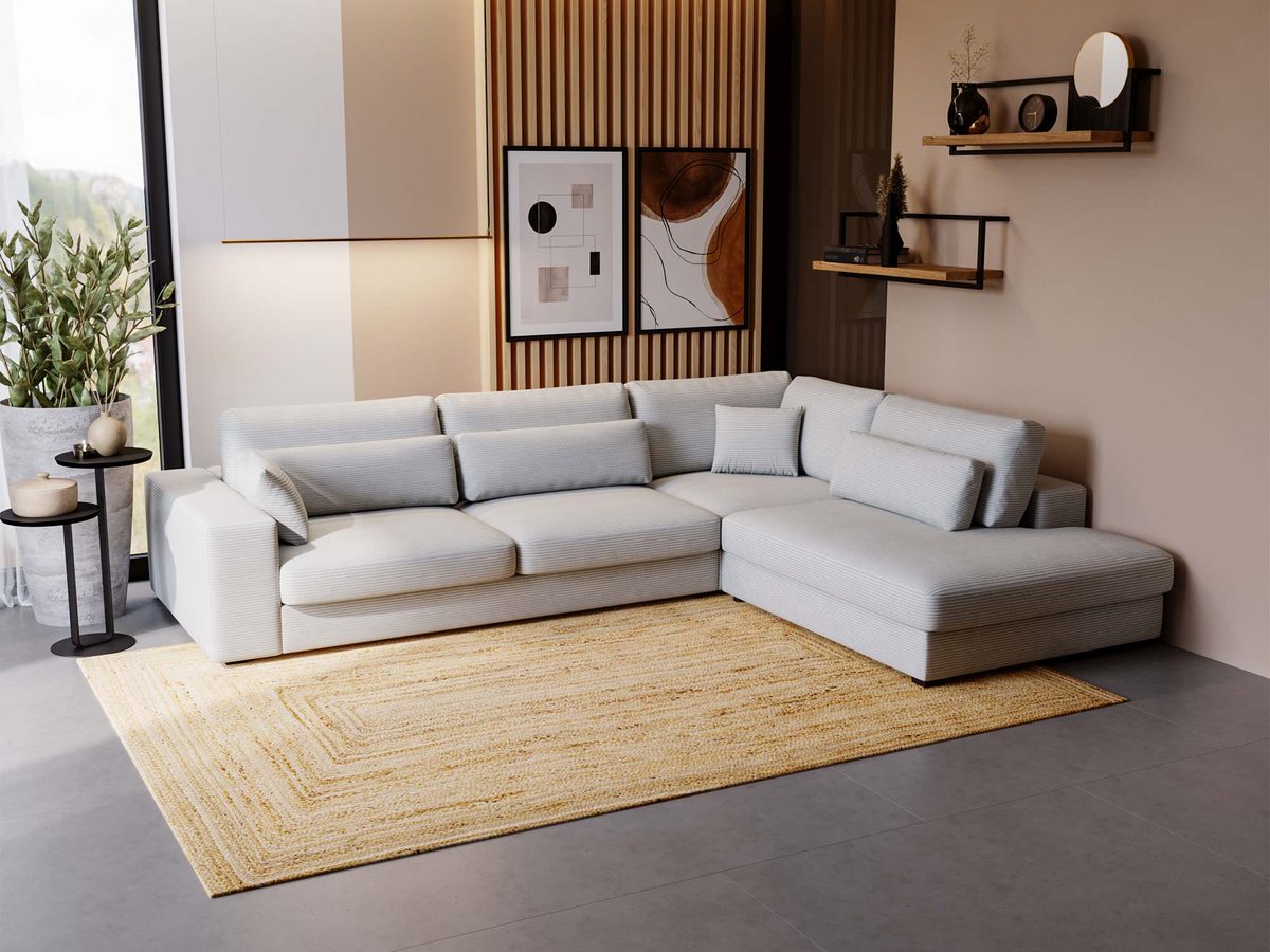 Jasnoszary narożnik z dużym siedziskiem i jasnym dywanem