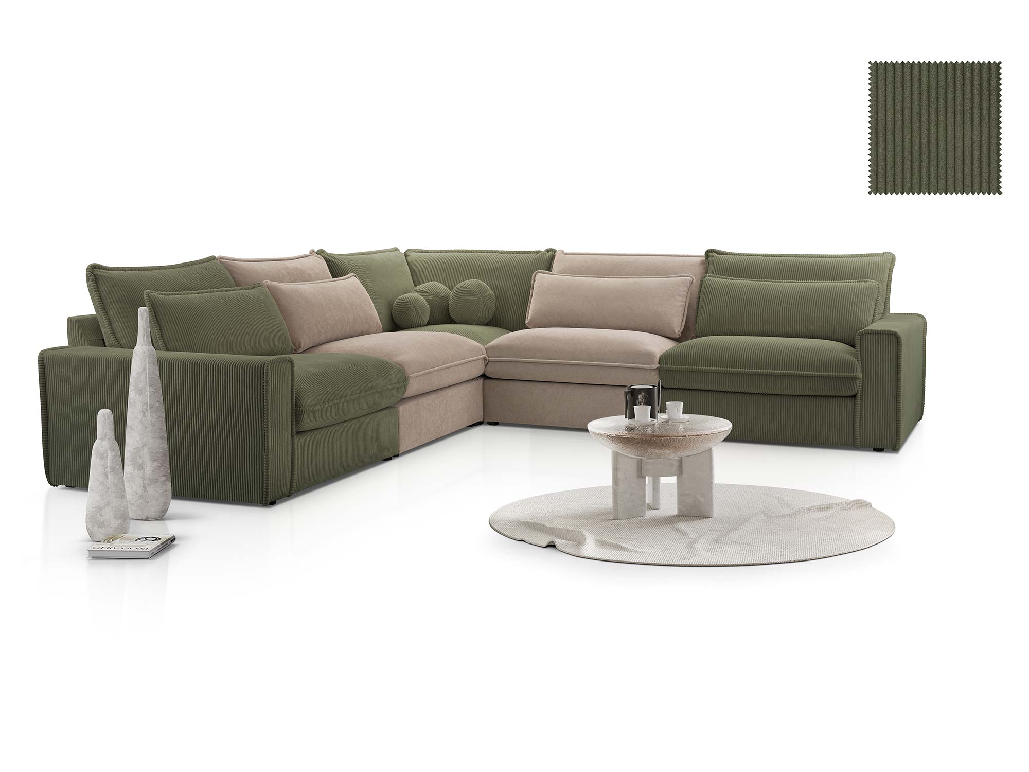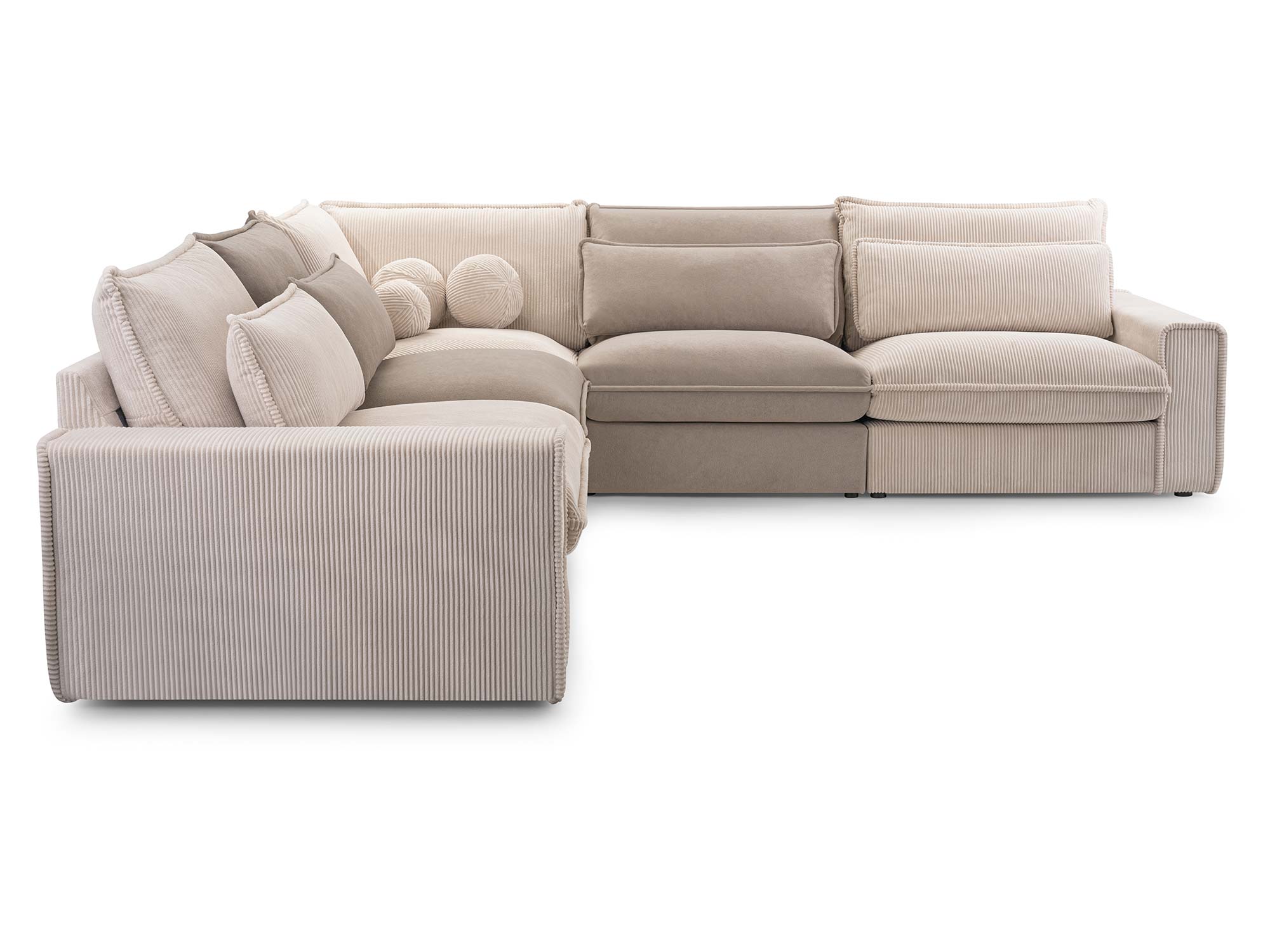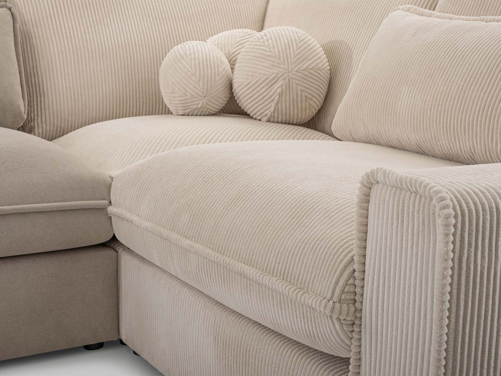 W zestawie znajdziesz 6 poduszek oparciowych, 4 poduszki płaskie oraz 3 ozdobne poduszki okrągłe. Dzięki nim narożnik nabiera wyjątkowego charakteru, a Ty możesz tworzyć aranżacje dopasowane do nastroju i okazji.