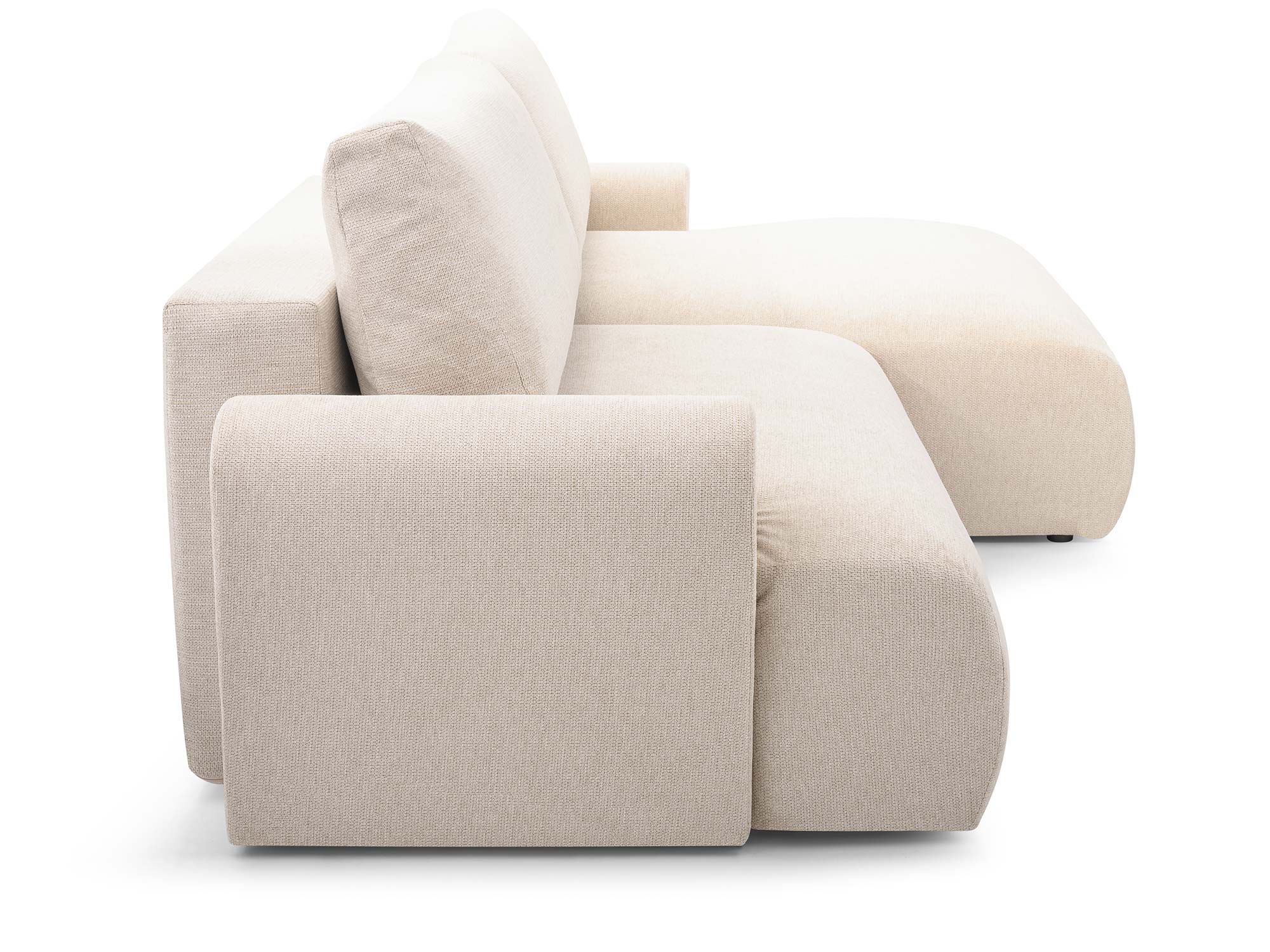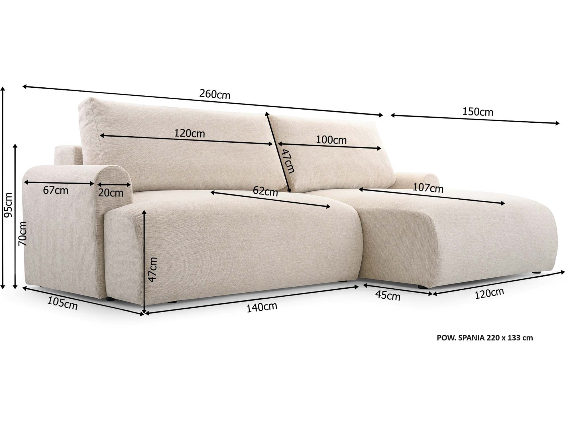 Rozkładanie odbywa się dzięki mechanizmowi DL – szybkiemu, prostemu i niezawodnemu. Wystarczy kilka chwil, aby przekształcić kanapę w wygodne łóżko o powierzchni 220×130 cm. To rozwiązanie idealne dla gości, którzy zostają na noc, ale także dla osób, które chcą, by ich salon pełnił funkcję dodatkowej sypialni. Do tego dochodzi pojemnik na pościel o wymiarach 120×66 cm, który pozwoli Ci utrzymać porządek i schować wszystkie niezbędne akcesoria.