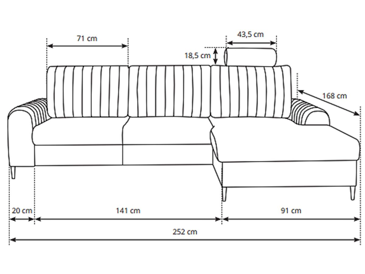Szerokość: 252 cm / Wysokość: 106,5 cm / Głębokość: 90-168 cm