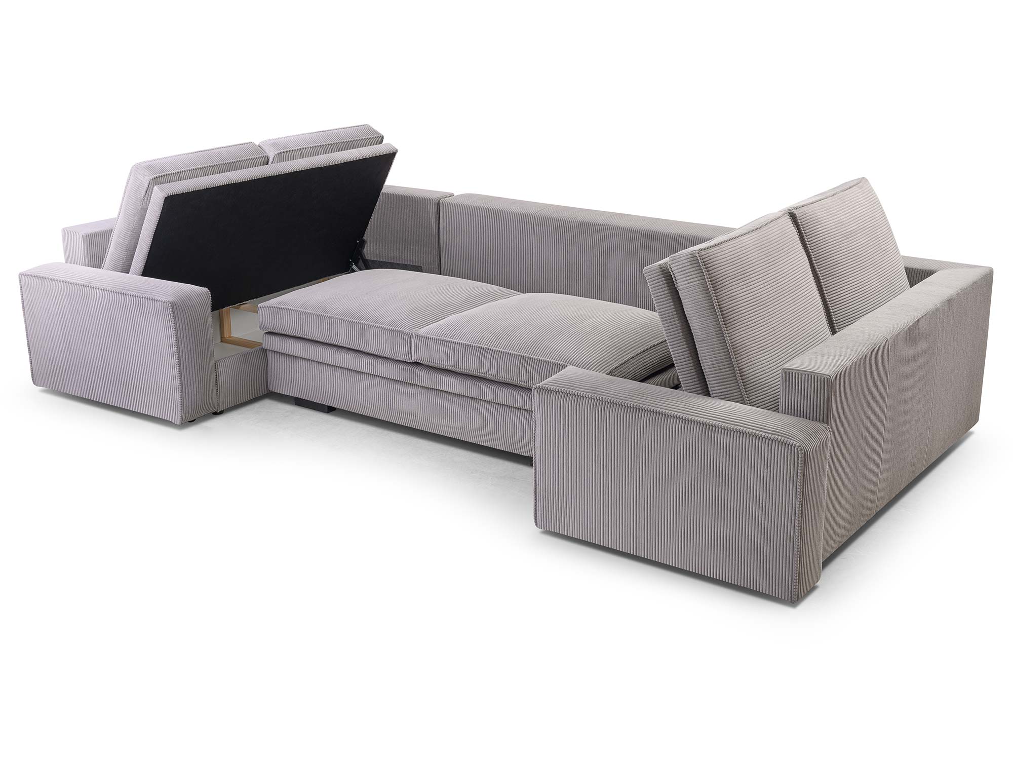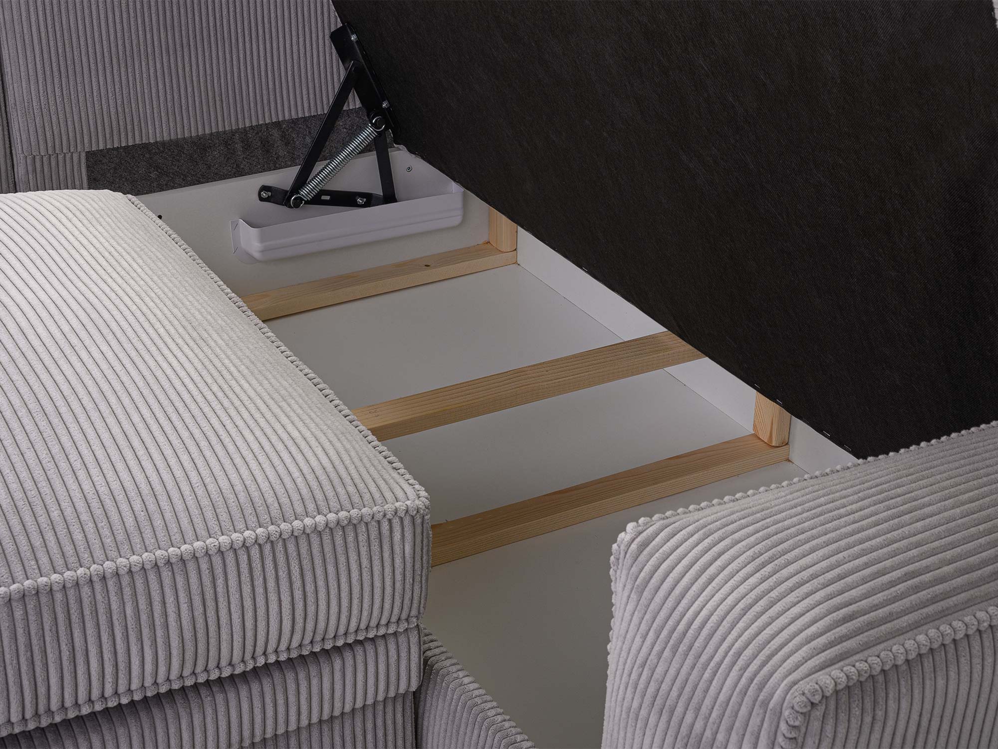 Jednym z największych atutów modelu Moa U jest funkcja spania. Mechanizm DL umożliwia szybkie i wygodne rozłożenie narożnika, tworząc powierzchnię spania o wymiarach 338×150 cm. To idealne rozwiązanie zarówno na co dzień, jak i w przypadku wizyty gości. Dodatkowym udogodnieniem jest pojemnik na pościel, dzięki któremu zyskujesz praktyczną przestrzeń do przechowywania.