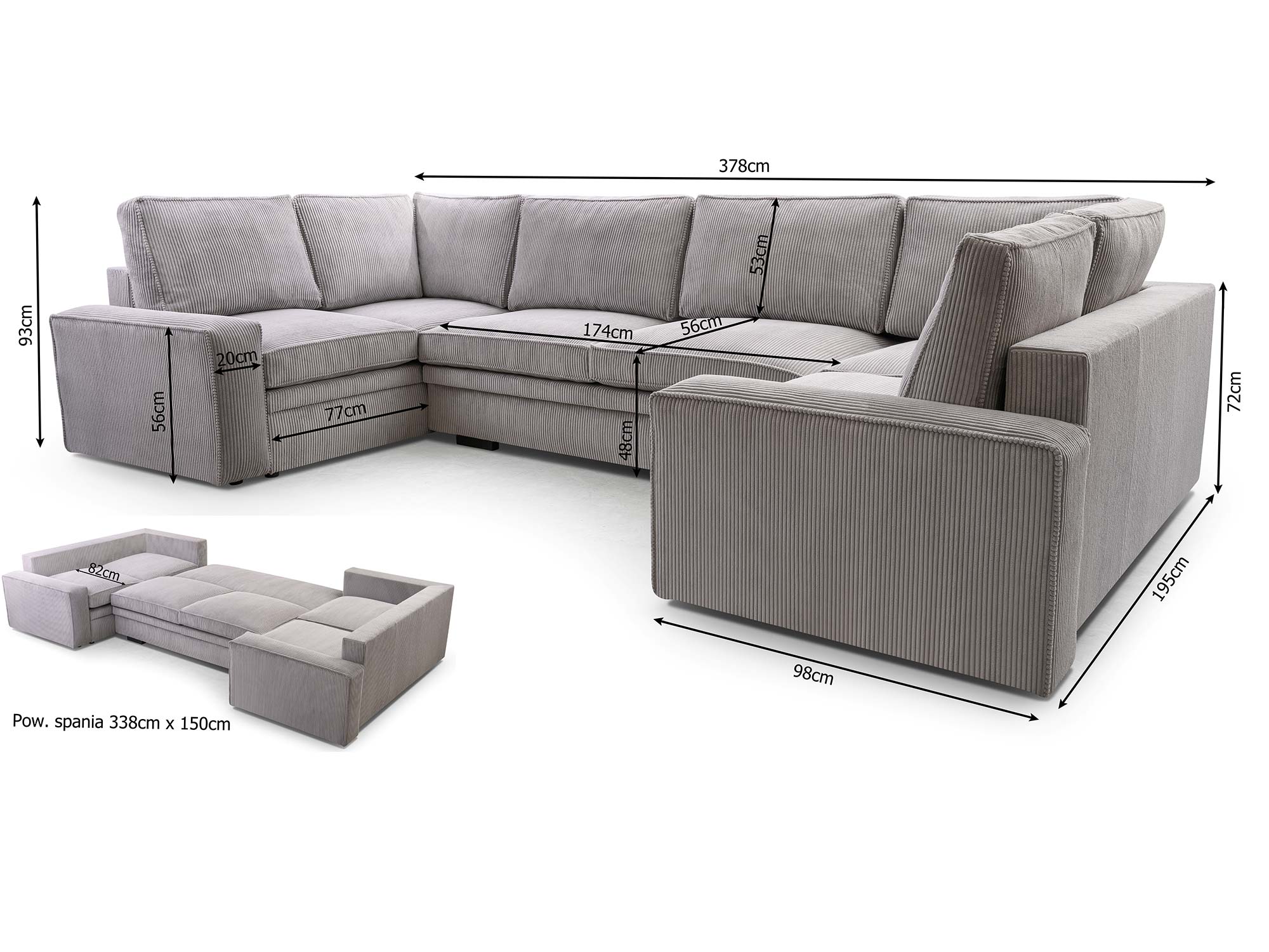 - Ogromna przestrzeń – szerokość 378 cm zapewnia miejsce dla całej rodziny i gości.