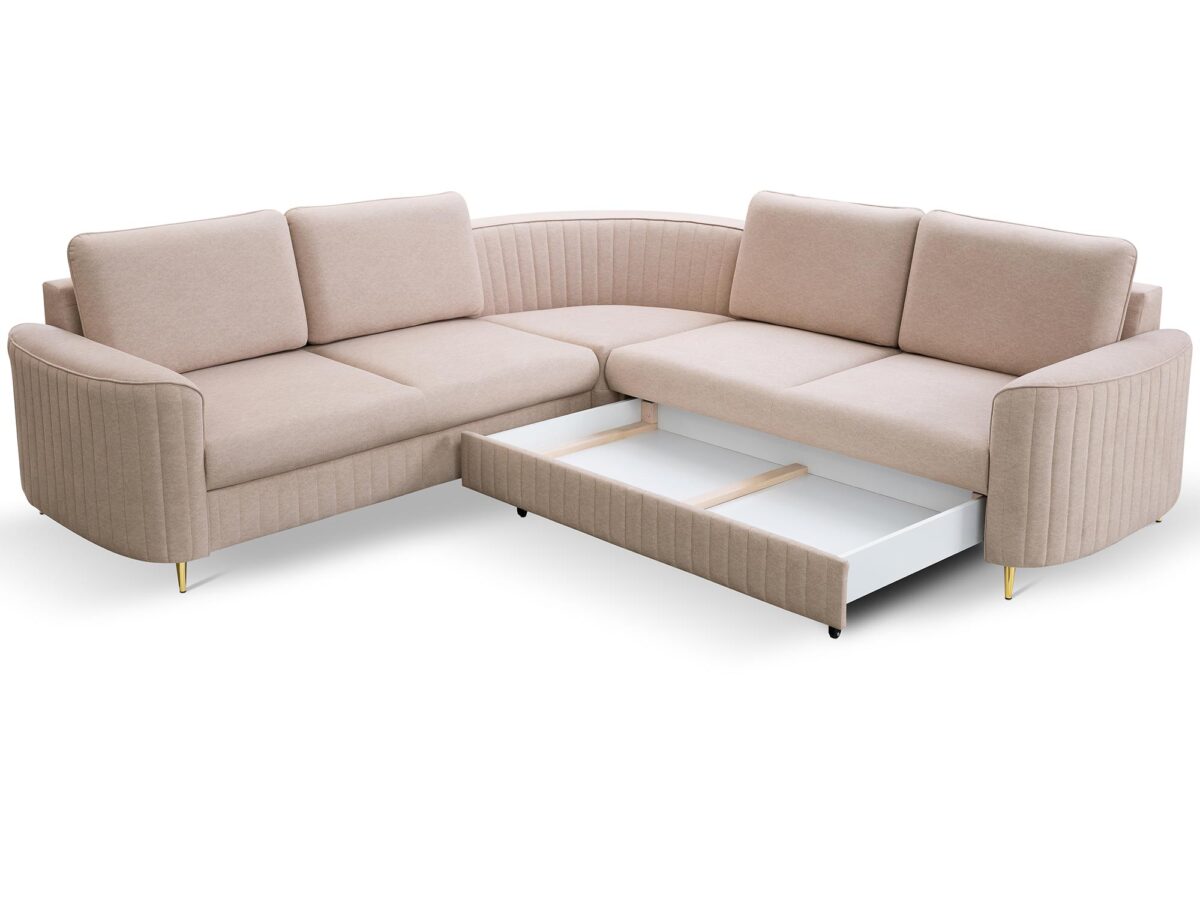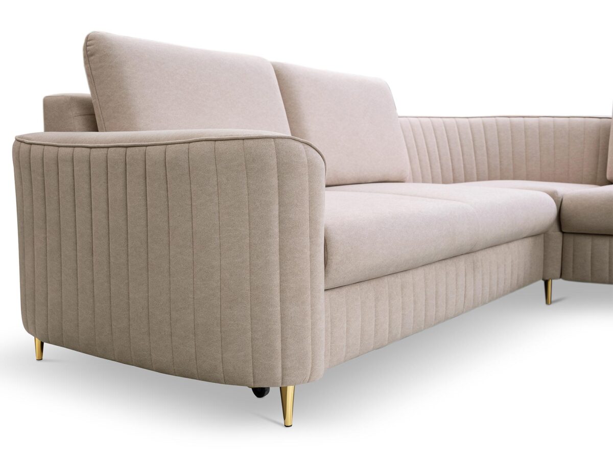- Wyrafinowany Styl Glamour: Modne przeszycia i złote metalowe nóżki nadają narożnikowi luksusowy charakter, idealny dla osób ceniących sobie elegancję w każdym calu swojego wnętrza.