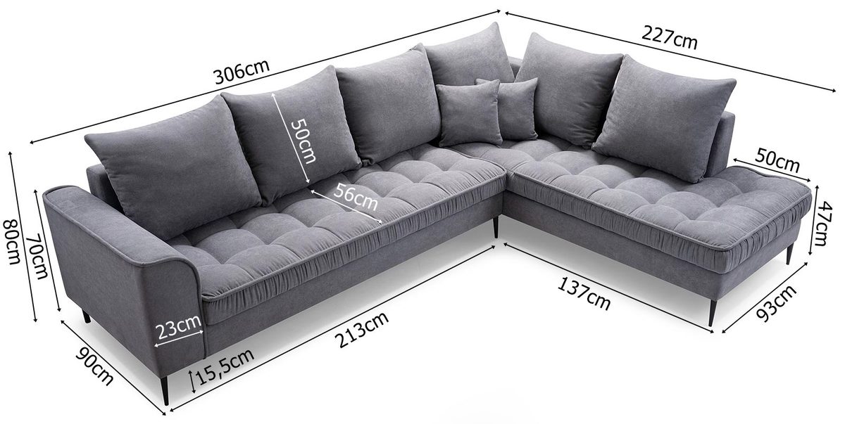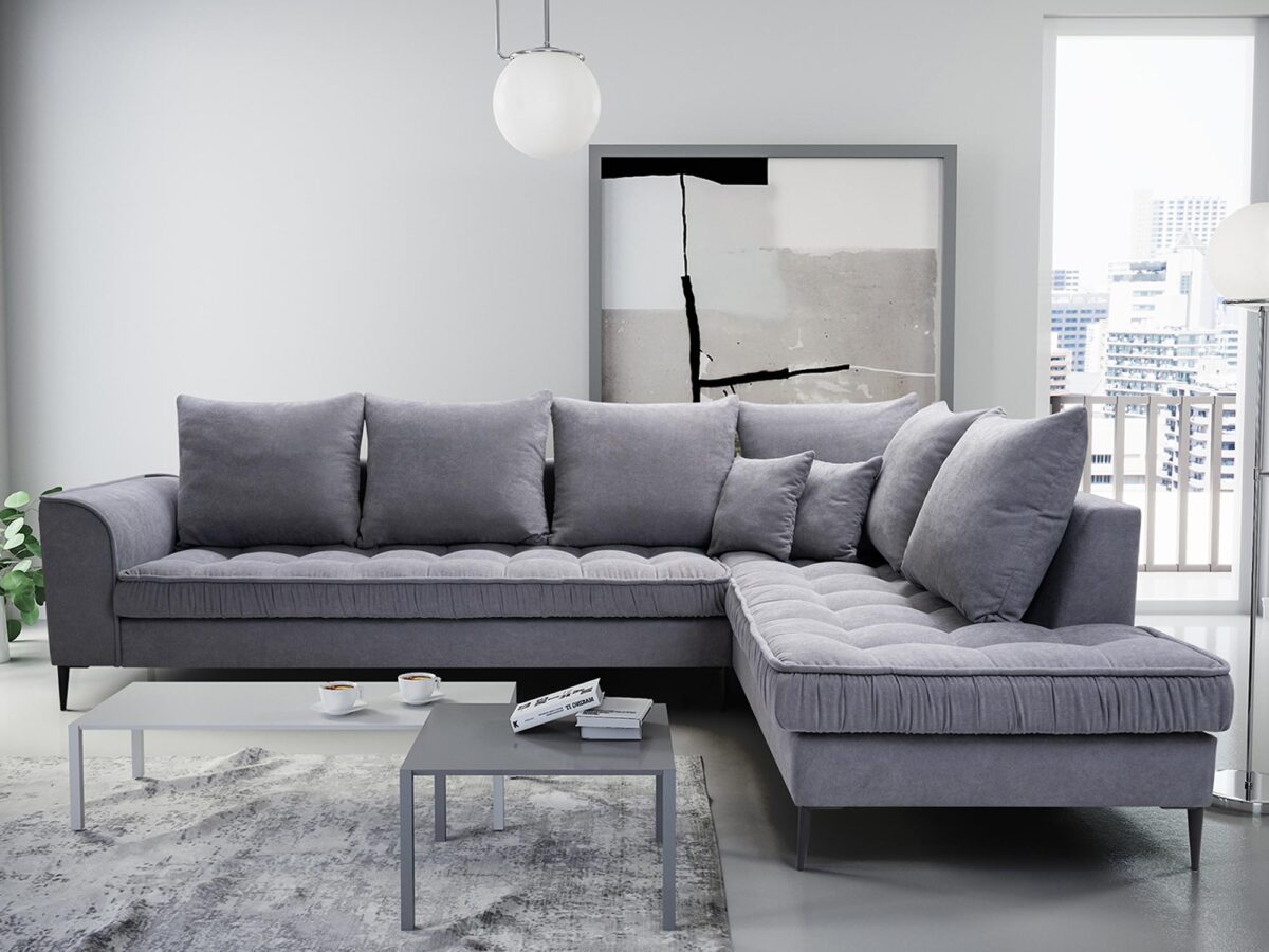 Co najważniejsze narożnik posiada wypełnienie z pianki tapicerskiej, sprężyn falistych i silikonu dlatego jest elastyczny a przy tym odporny na zniekształcenia. Co więcej w komplecie posiada dekoracyjne poduszki. Ponadto mebel ten dostępny jest zarówno w wersji prawo jak i lewostronnej do wyboru.
