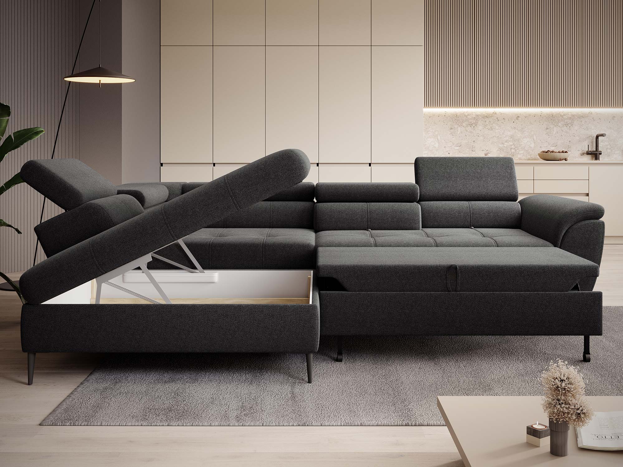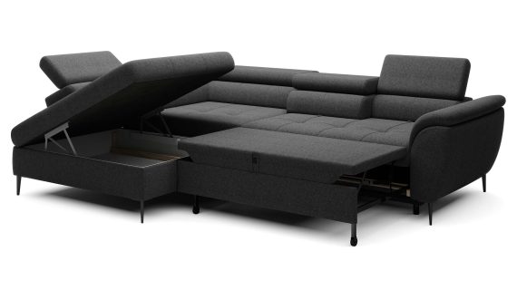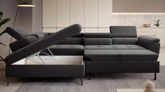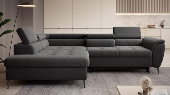 Wyobraź sobie salon, w którym wszystko dzieje się płynnie: w kilka sekund zmieniasz wygodną sofę w obszerne łóżko, dopasowujesz głębokość siedziska do chwili, a zagłówki ustawiasz tak, by odciążyć kark. TEMPO 2025 to narożnik, który łączy funkcję spania 140 × 220 cm, przesuwne oparcia (3 szt.), ruchome zagłówki (5 szt.) oraz praktyczny pojemnik na pościel. Dzięki eleganckiej linii i dopracowanym detalom staje się naturalnym sercem nowoczesnego salonu – piękny w odbiorze i świetnie przemyślany na co dzień.
