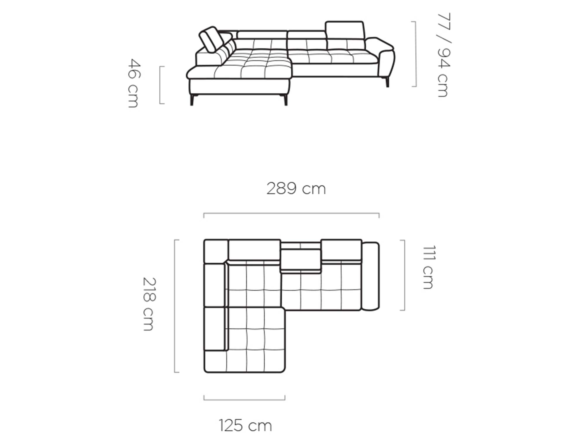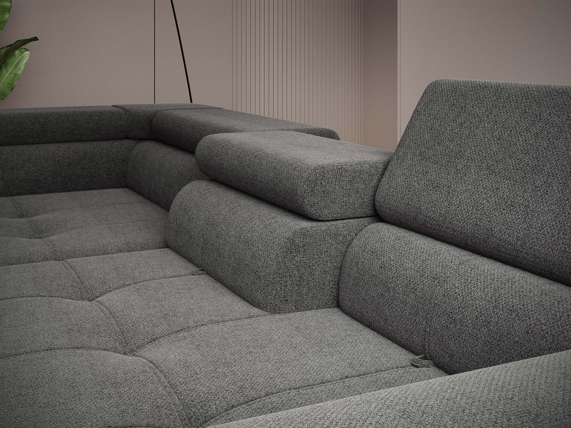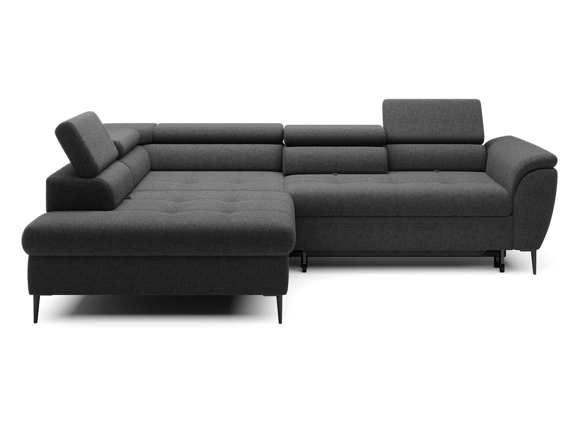 Swoboda aranżacji. Model dostępny jest w układzie prawym/lewym, a tapicerowany tył pozwala ustawić narożnik przy ścianie lub centralnie. Metalowe nogi (ok. 14 cm) ułatwiają sprzątanie oraz współpracę z robotami sprzątającymi.