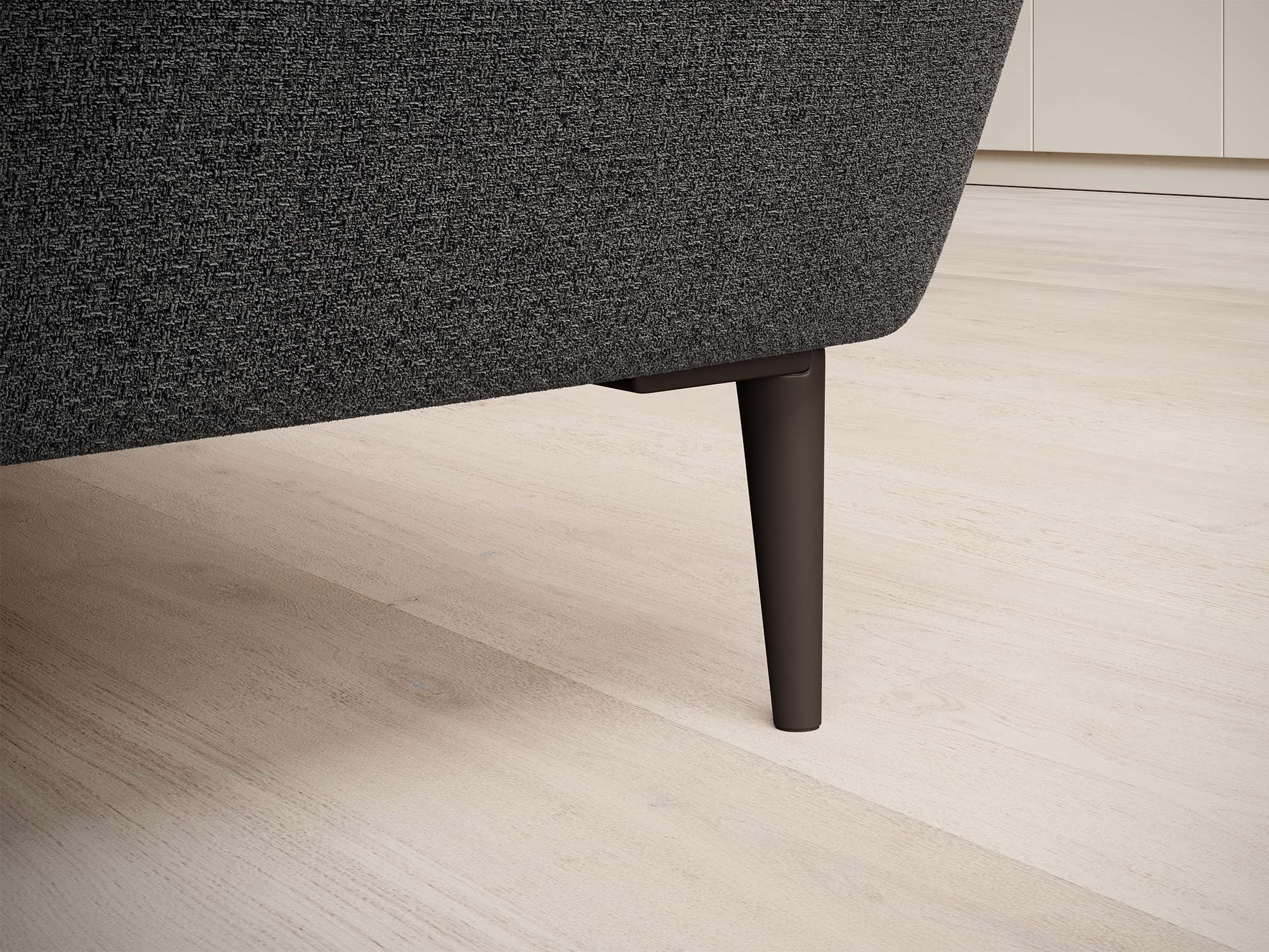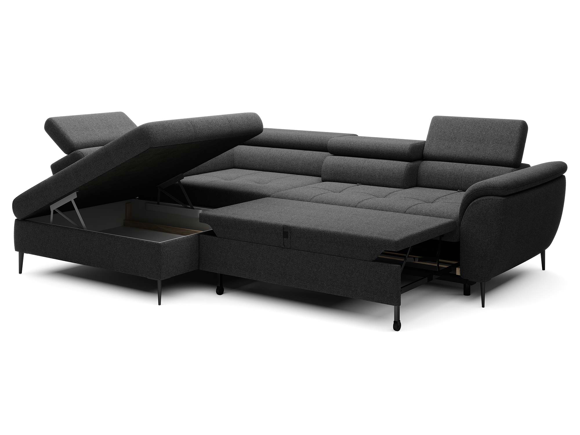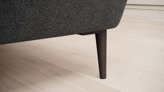 Smukłe, czarne nogi metalowe (ok. 14 cm) unoszą bryłę i dodają jej lekkości, a tapicerowany tył pozwala ustawić narożnik także centralnie, w otwartej przestrzeni.