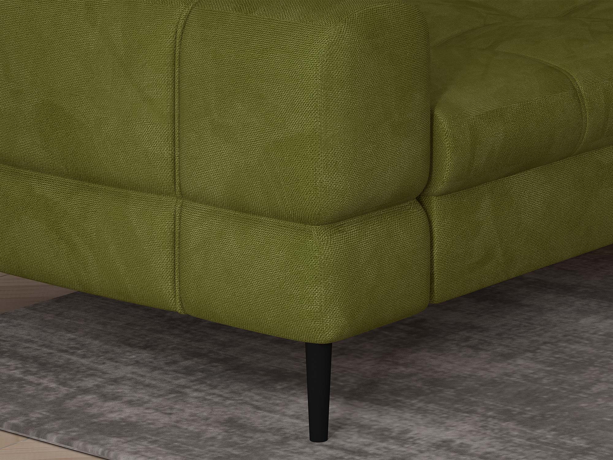 Detale użytkowe. Tapicerowany tył i moduł „Kubuś” pozwalają wyeksponować narożnik wyspowo. Metalowe nogi 14 cm dodają elegancji i ułatwiają sprzątanie (wjedzie większość robotów). Model dostępny w układzie prawym/lewym i dostarczany jako mebel do montażu – zorganizujesz wniesienie i ustawienie bez zbędnych utrudnień.