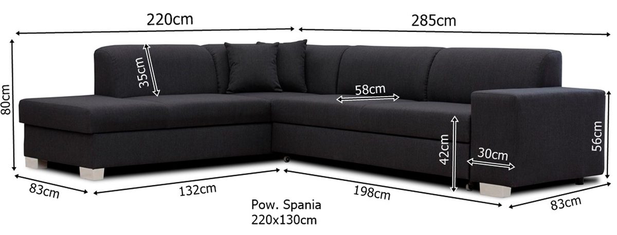 Co najważniejsze duży narożnik z pojemnikiem tapicerowany jest tkaniną dostępną w szerokiej gamie kolorystycznej do wyboru. Ponadto model ten posiada drewniany stelaż wypełniony pianką tapicerską T-30 i sprężyną falistą na siedzisku. Przede wszystkim zapewnią one odpowiednią twardość, a przy tym przeciwdziałają tworzenie się nieestetycznych odkształceń. Dodatkowo narożnik ten dostępny jest w wersji prawo- i lewostronnej do wyboru, dzięki czemu łatwo można dopasować go do aranżowanego pomieszczenia. Co więcej mebel ten nie tylko zapewni komfortowy wypoczynku, ale także doskonale zaprezentuje się we wnętrzu.