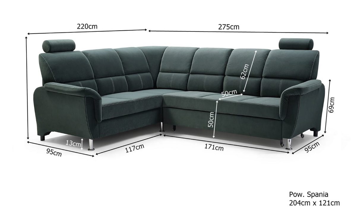 Co najważniejsze narożnik posiada wysuwane oparcie, które pozwala na wygodne położenie się w pozycji półleżącej. Dodatkowo model ALEXIS ma pojemnik na pościel oraz funkcję spania, dlatego też pozwoli bez problemu przenocować zaproszonych gości. Ponadto konstrukcja narożnika oparta jest na solidnym drewnianym stelażu, a w środku mebel wypełniono pianką tapicerską i sprężyną falistą. Co więcej oryginalnym akcentem tego modelu są nóżki w kolorze chromu. Co więcej kolorystykę mebla można wybrać z szerokiej gamy wybarwień.