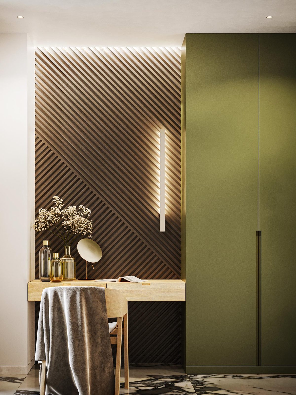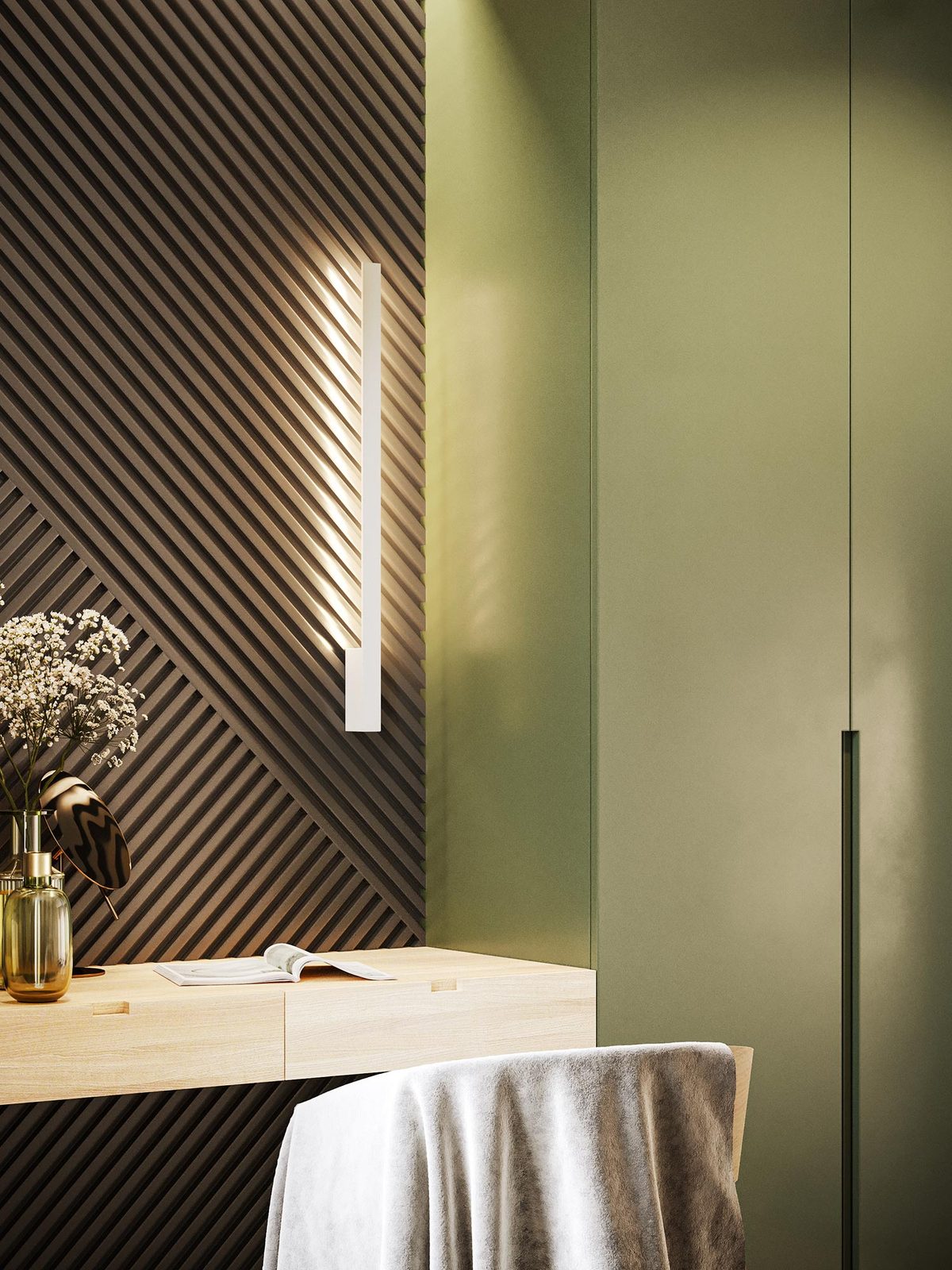 Złota lampa pionowa LED przy lustrze i teksturowanej ścianie