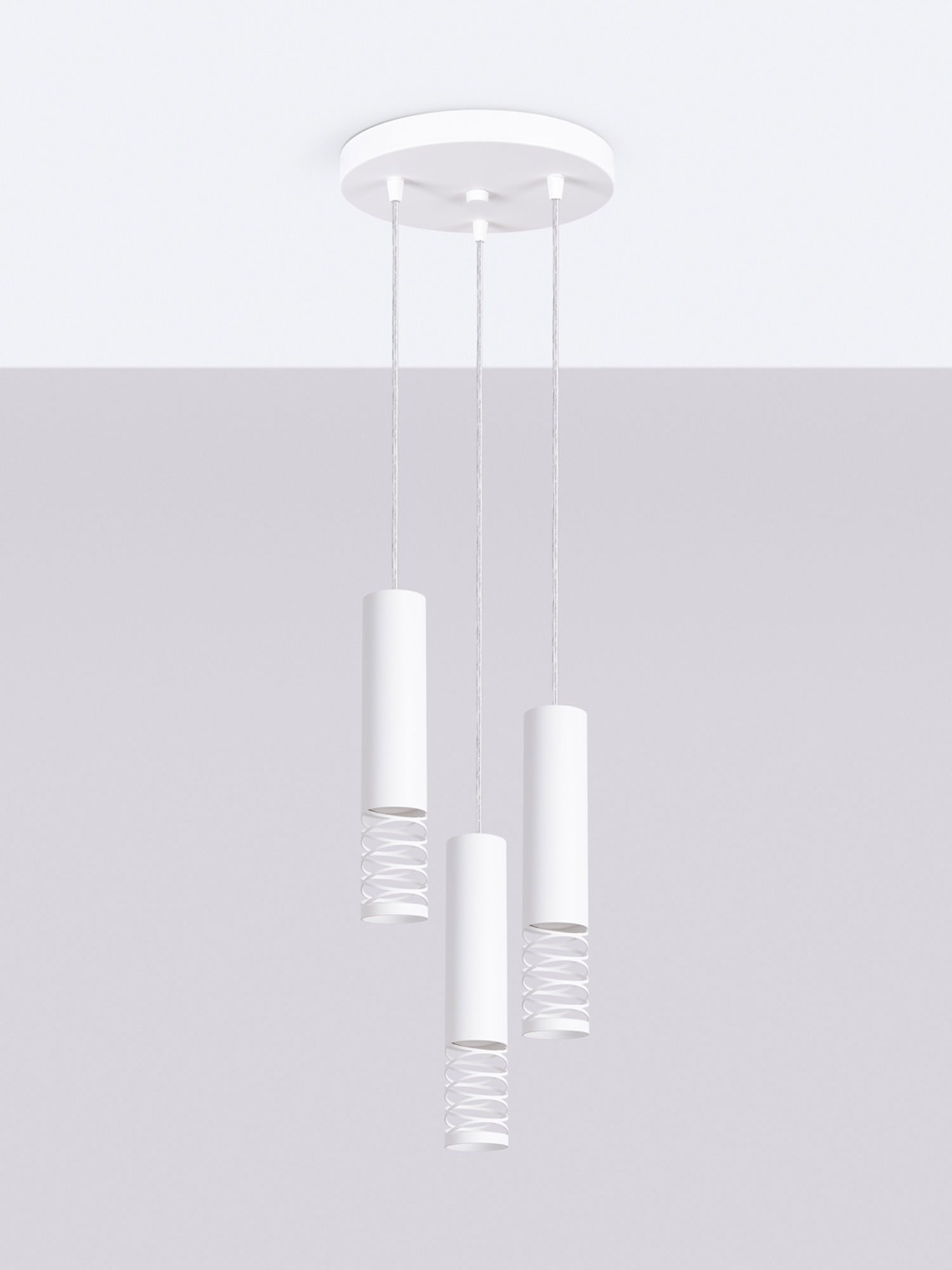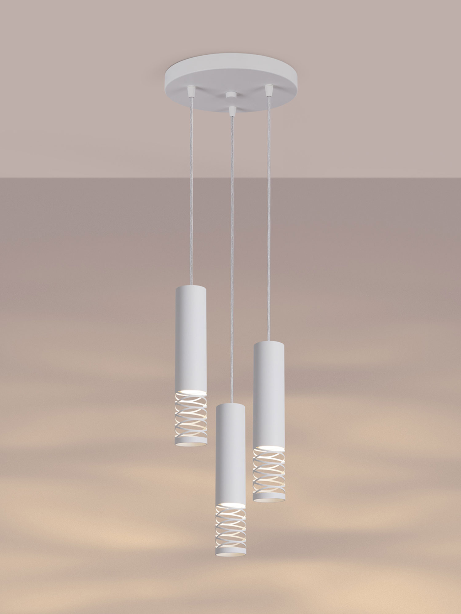 Model LAMIR 3P biały wyróżnia się smukłymi kloszami o cylindrycznym kształcie (6/30 cm), które zawieszone są na podsufitce o wymiarach 25/3 cm. Trzy źródła światła GU10, rozłożone w równych odstępach, dają równomierne oświetlenie, które sprawdzi się zarówno nad stołem w jadalni, jak i w przestronnym salonie. Dzięki temu wnętrze staje się pełne światła, a każda chwila spędzona w domu nabiera wyjątkowego charakteru.