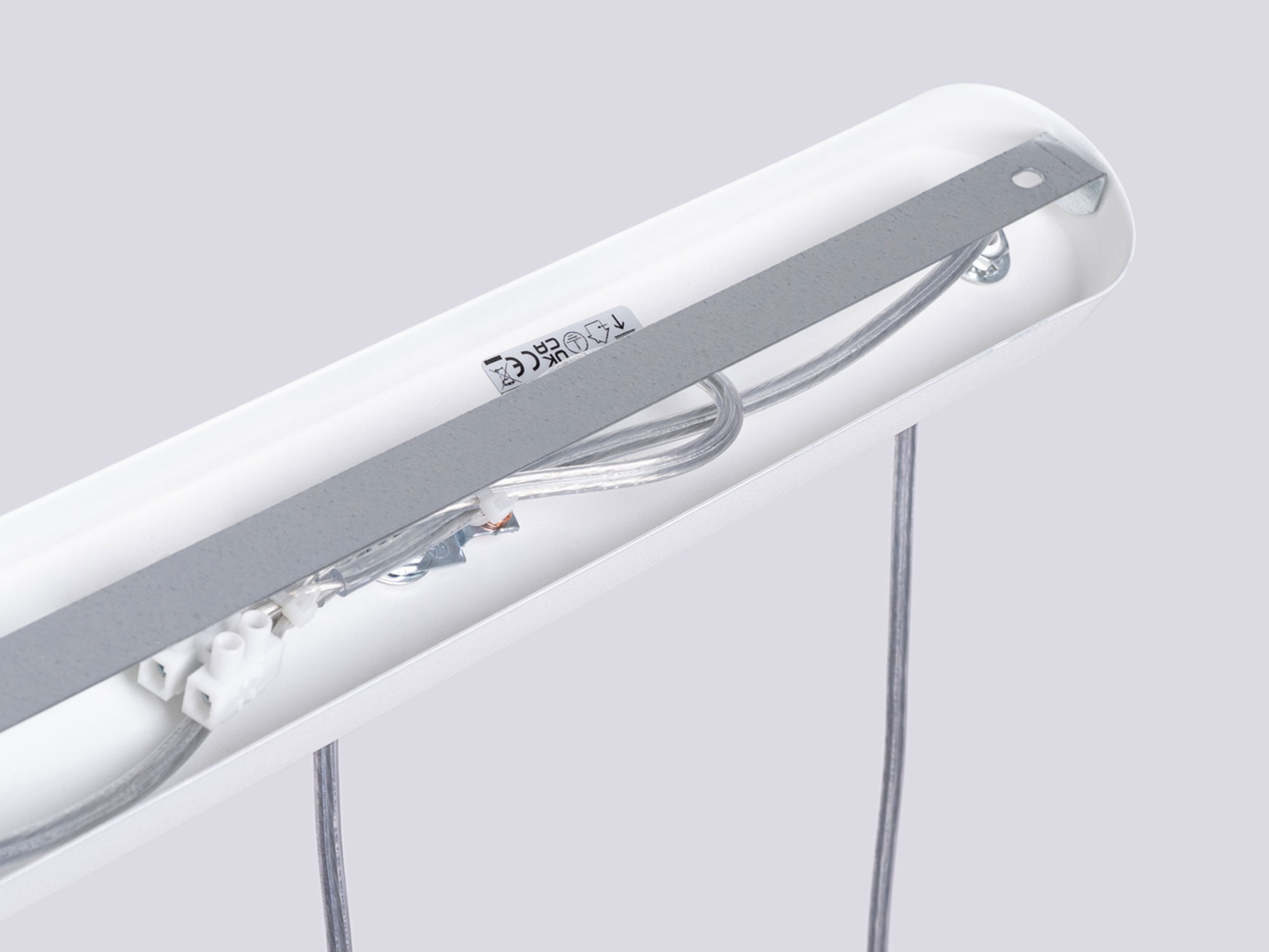 Biały kolor lampy wnosi do wnętrza świeżość i harmonię. Doskonale komponuje się zarówno z jasnymi, minimalistycznymi aranżacjami, jak i z ciemniejszymi wnętrzami, gdzie staje się kontrastowym akcentem. Lampa ma wysokość 125 cm i długość 40 cm, dzięki czemu idealnie sprawdza się nad stołem jadalnym, wyspą kuchenną czy w reprezentacyjnym salonie.