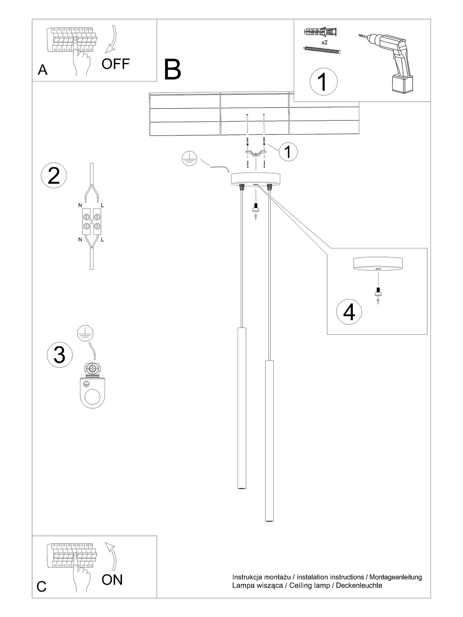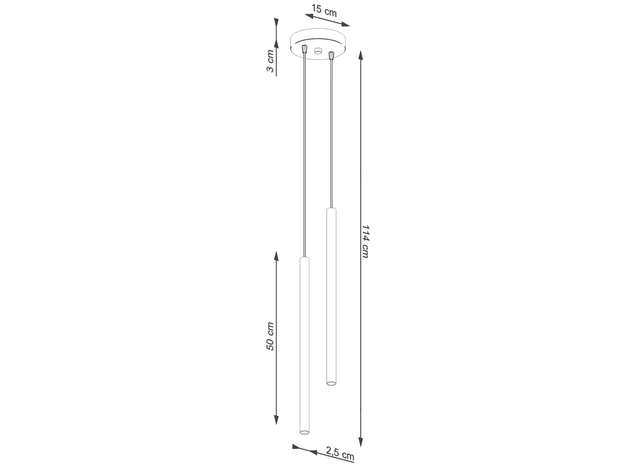 Smukłe klosze o wymiarach 2,5/50 cm zostały zaprojektowane tak, aby subtelnie rozpraszać światło, podkreślając detale wnętrza bez efektu oślepiania. Podsufitka o wymiarach 15/3 cm zapewnia stabilny montaż i eleganckie wykończenie. Całość ma wysokość 114 cm, co czyni lampę idealnym wyborem zarówno do mieszkań o standardowej wysokości, jak i loftowych przestrzeni.