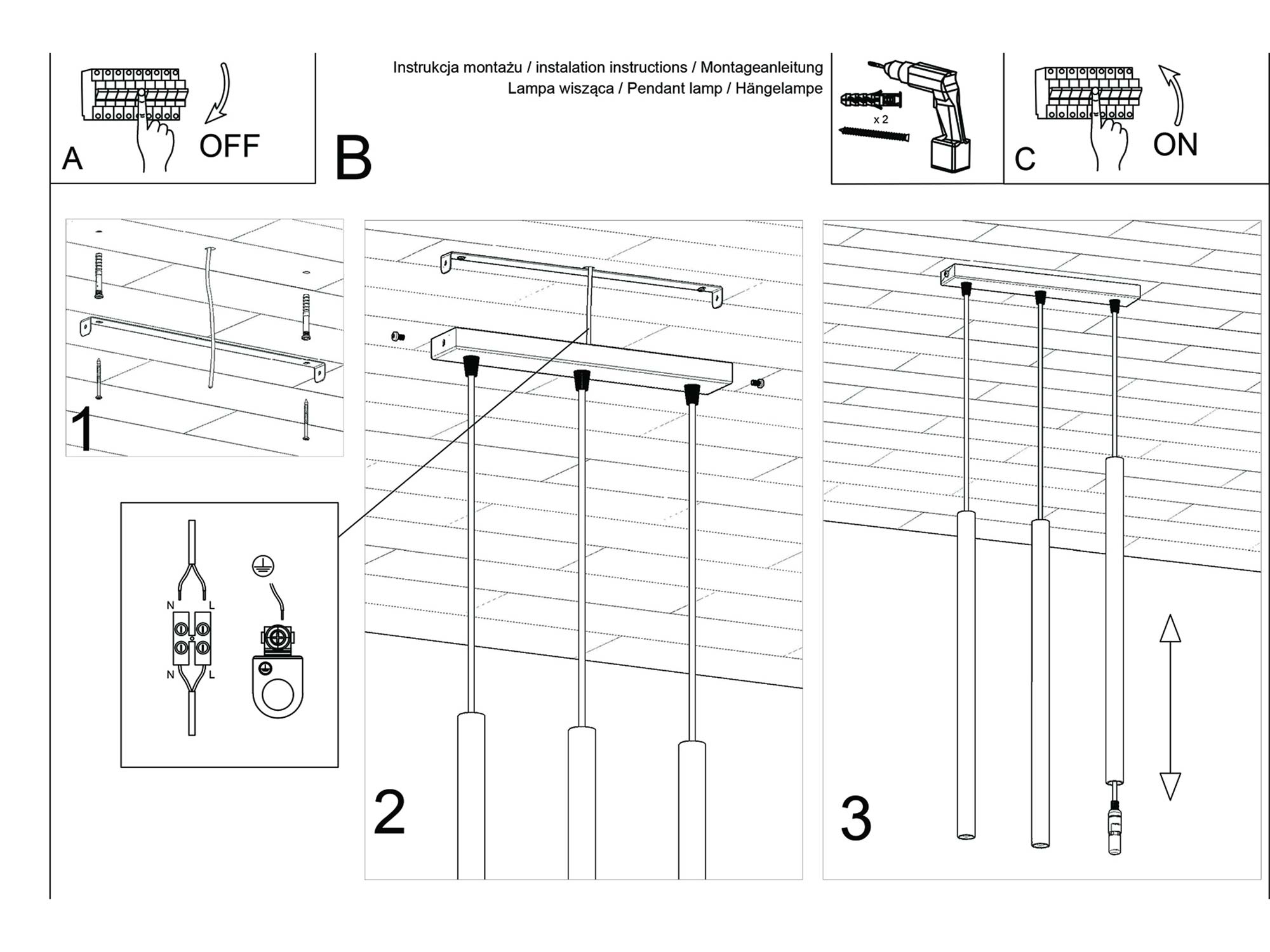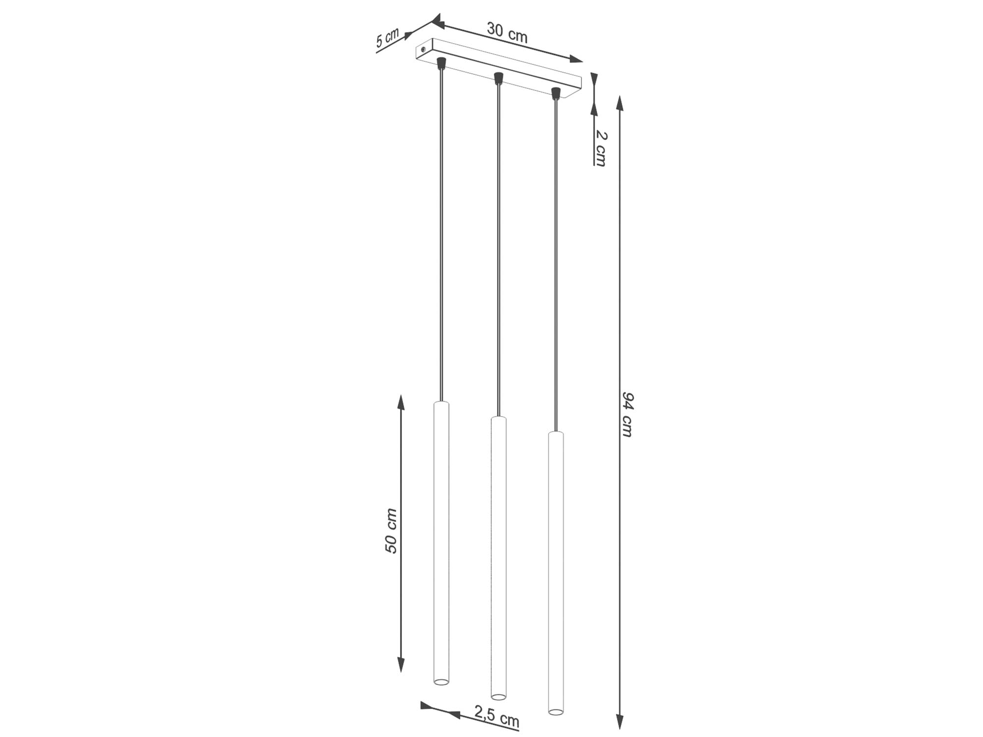 Lampa wyróżnia się proporcjonalną i lekką konstrukcją o wymiarach 30/5/94 cm. Smukłe klosze w kształcie cylindrów idealnie rozpraszają światło, tworząc subtelny efekt wizualny. To rozwiązanie, które doskonale sprawdzi się nad stołem w jadalni, nad kuchenną wyspą, a także w salonie czy przestrzeni biurowej. Dzięki swojej formie lampa nie przytłacza wnętrza, a jednocześnie nadaje mu charakteru i elegancji.