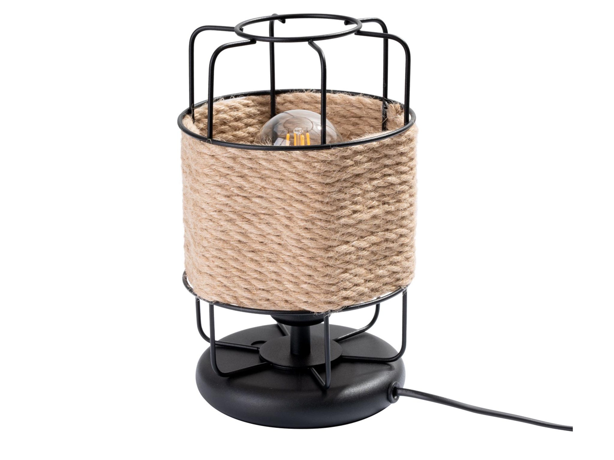 Lampa stołowa z plecionym kloszem i czarną podstawą
