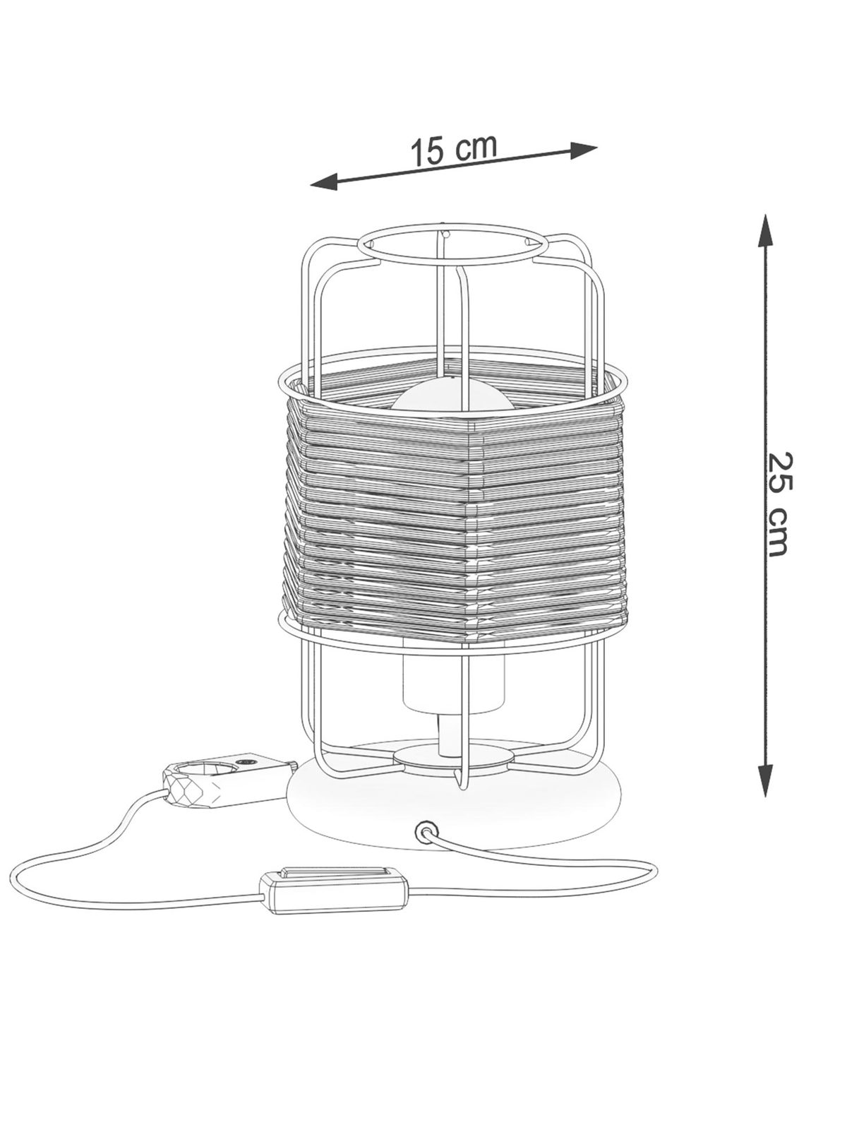 Rysunek z wymiarami lampy stołowej z wikliny i metalu