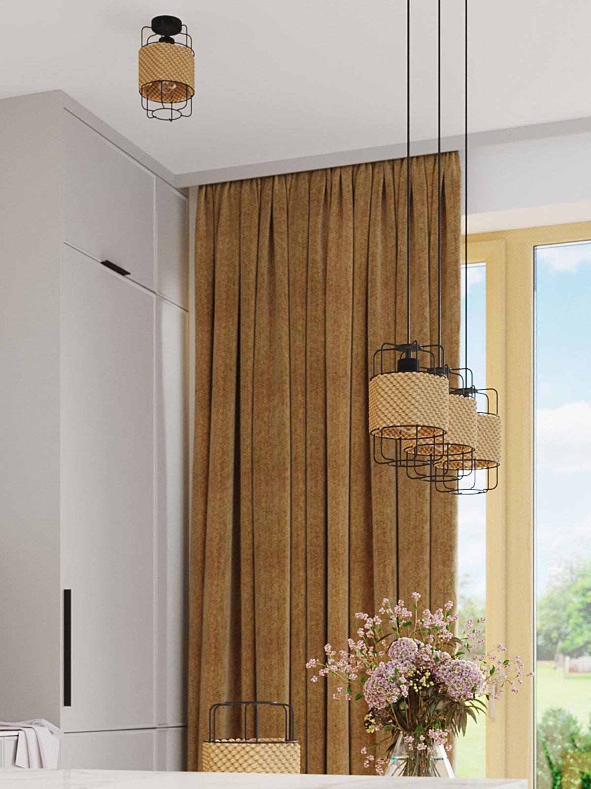 Trzy lampy plecione nad stołem w nowoczesnej kuchni