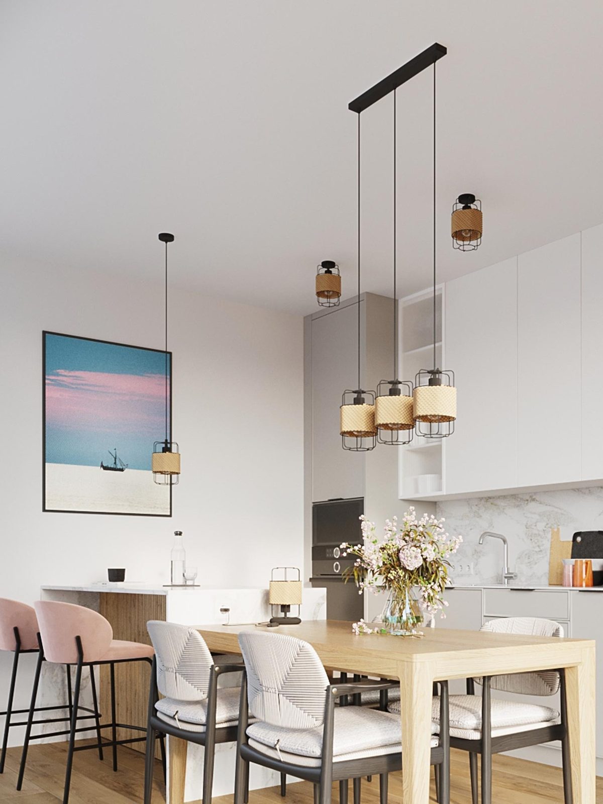 Nowoczesna jadalnia z sześcioma lampami z plecionym abażurem