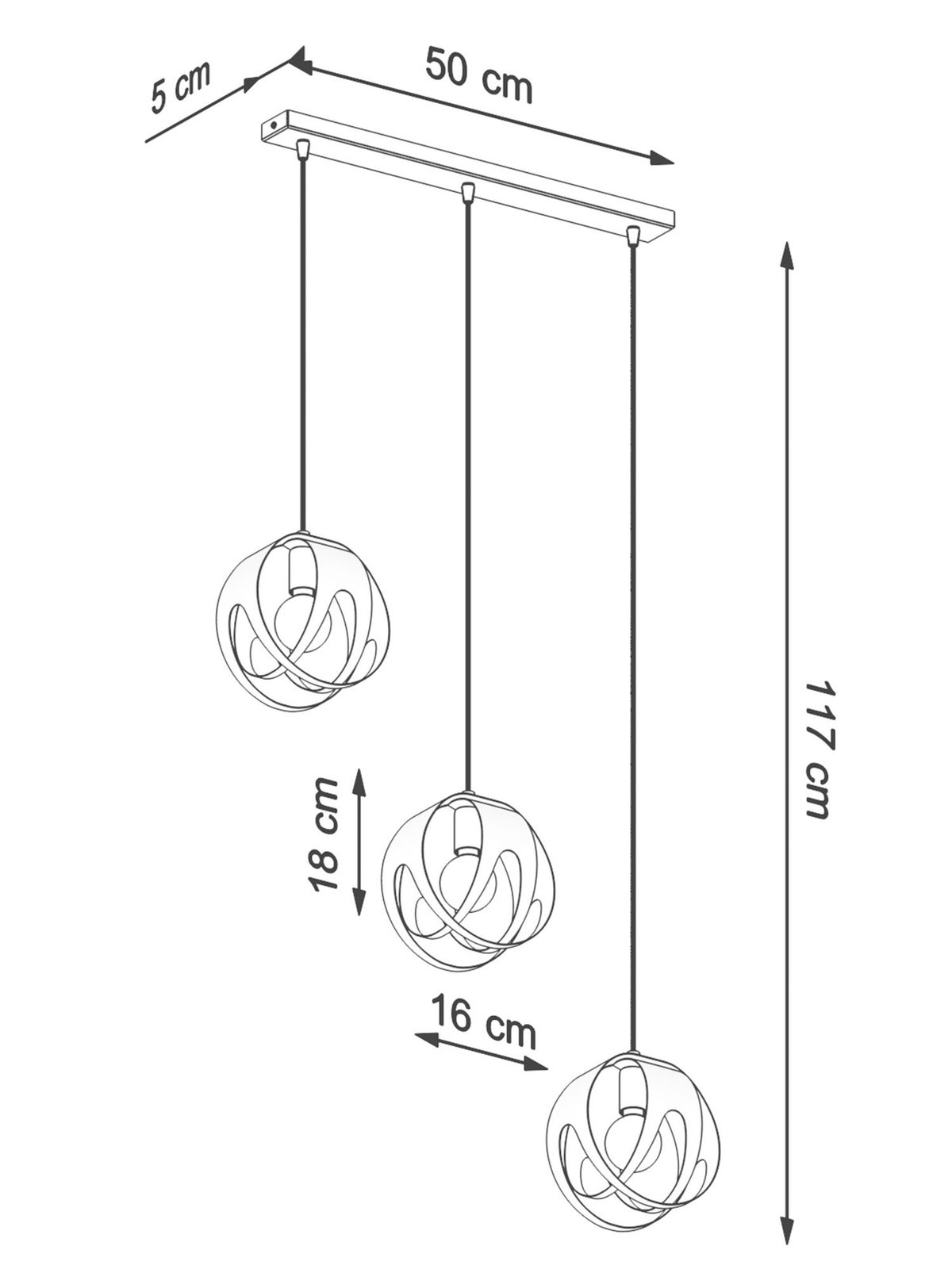 Techniczny rysunek nowoczesnej lampy wiszącej z trzema kloszami