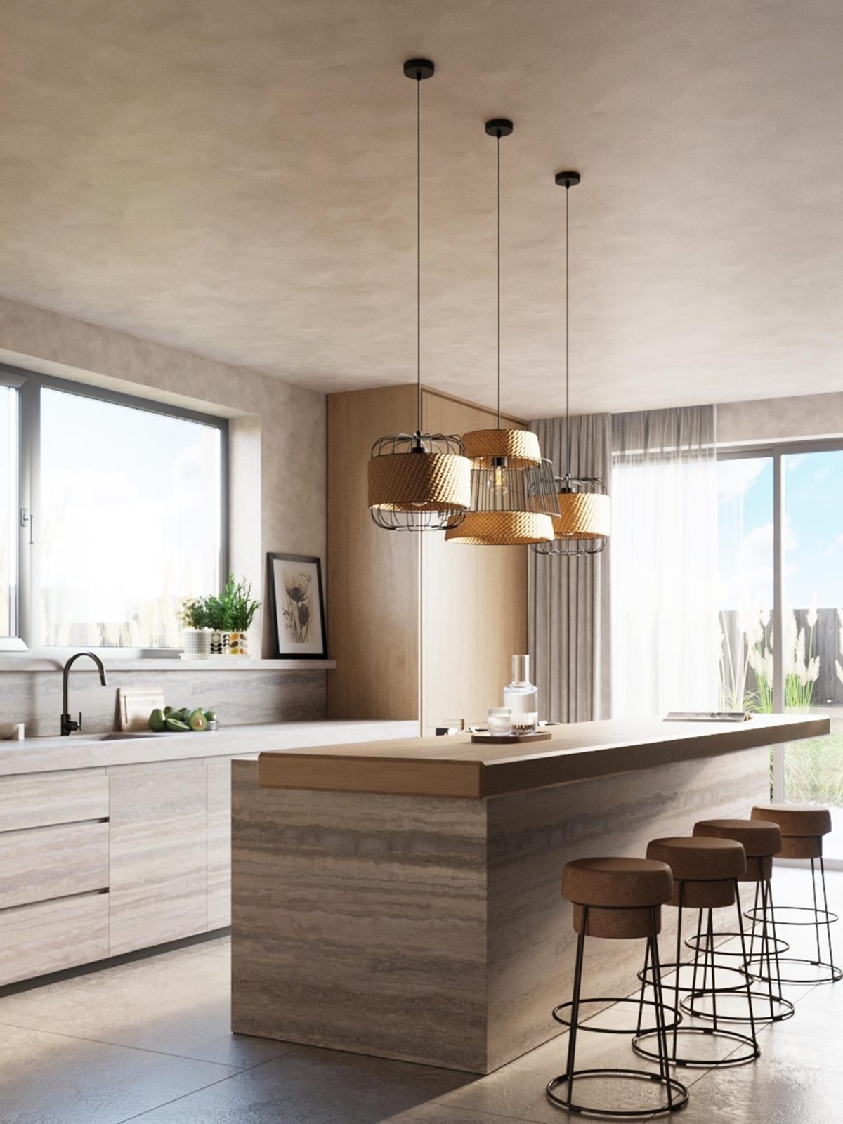 Dwie lampy wiszące z plecionymi kloszami nad wyspą kuchenną