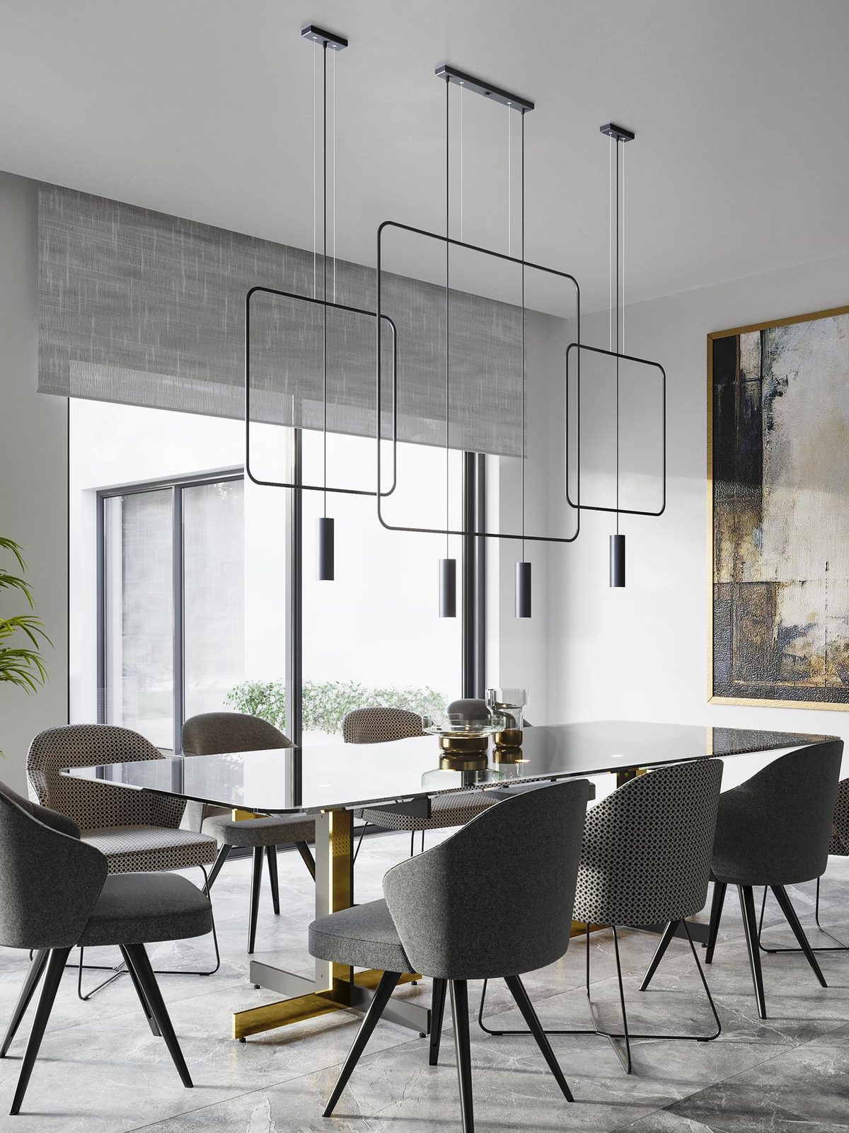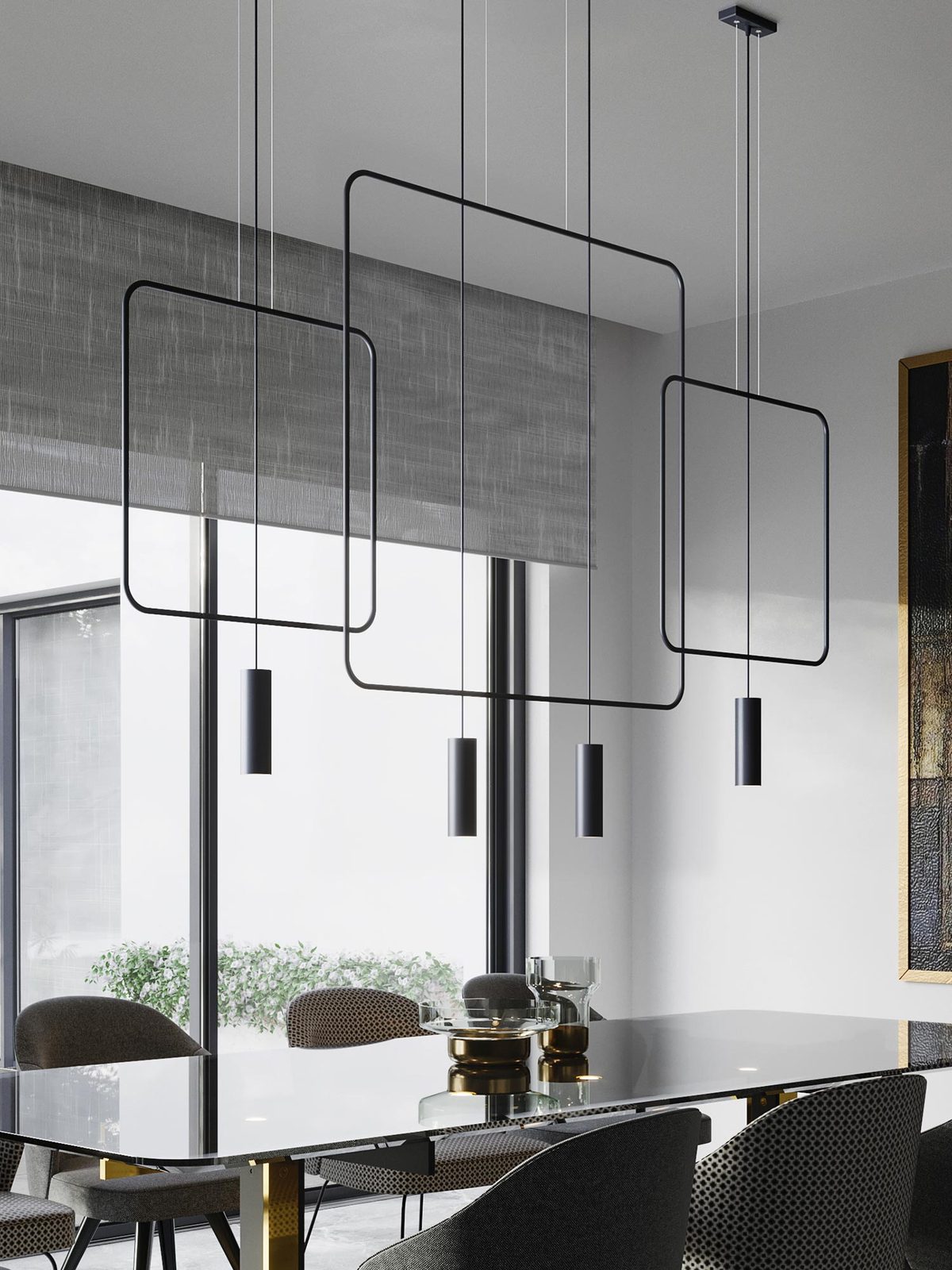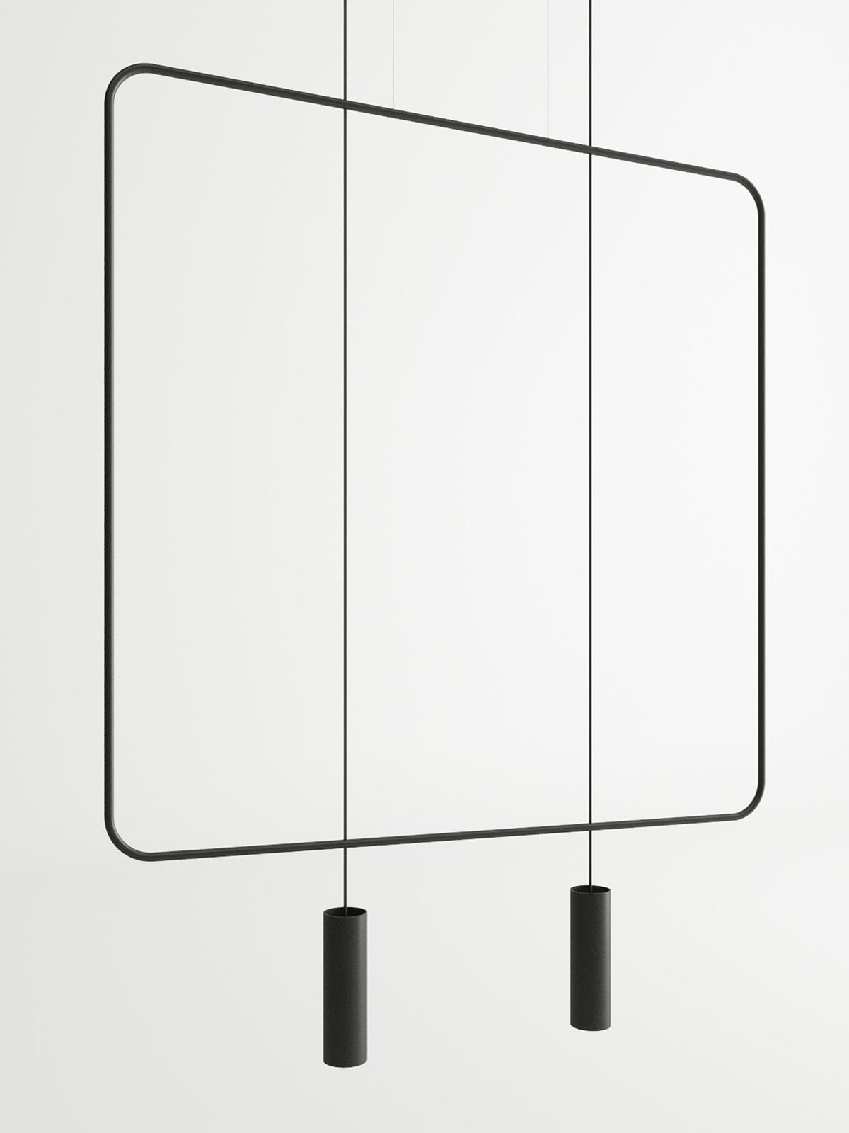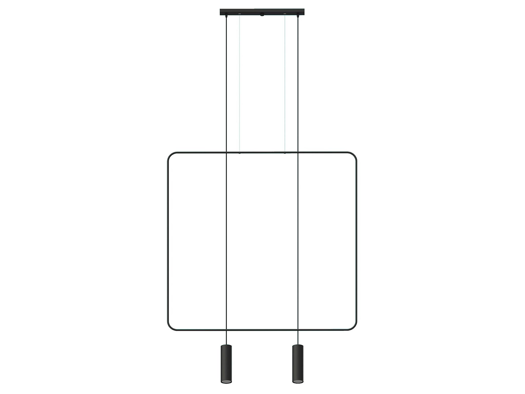 RADIUS 2 to czarna lampa wisząca, która dzięki swojej surowej, geometrycznej formie stanowi doskonały akcent w nowoczesnych wnętrzach. Tworząc efekt przestrzennej kompozycji, stalowe linki zakończone owalnymi tubami, obrysowane regularną ramą, nie tylko spełniają funkcje użytkowe, ale także dekoracyjne.