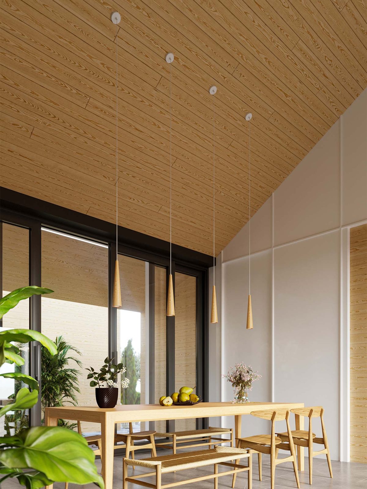 Drewniane lampy wiszące nad stołem – nowoczesne wnętrze