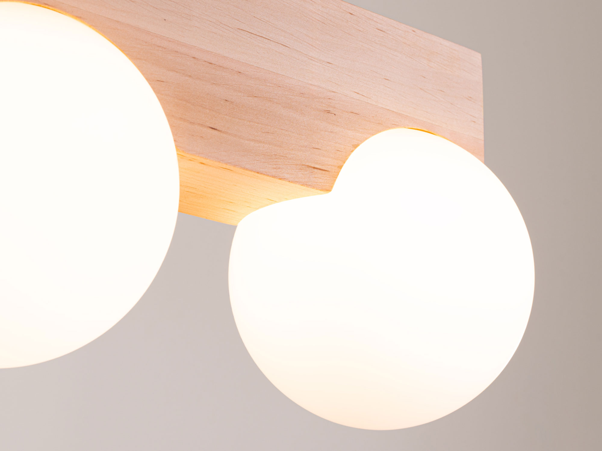 Szklane klosze równomiernie rozpraszają światło, zapewniając miękkie i przyjemne oświetlenie. Dzięki temu plafon tworzy we wnętrzu atmosferę sprzyjającą relaksowi, jednocześnie podkreślając walory estetyczne pomieszczenia. Naturalne drewno ociepla aranżację, sprawiając, że przestrzeń staje się bardziej przyjazna i elegancka.