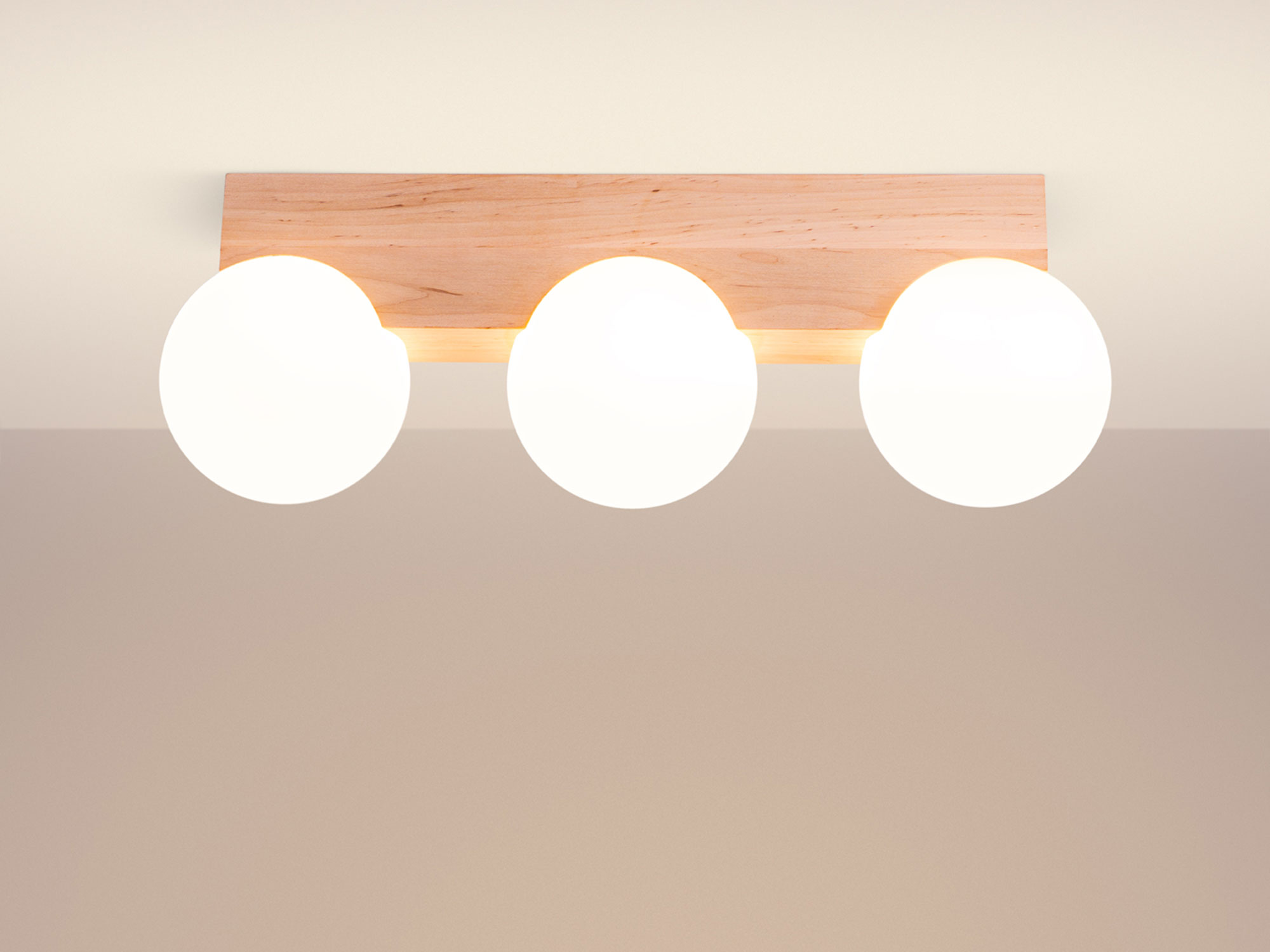 Światło ma ogromny wpływ na nastrój panujący w pomieszczeniu. Plafon BOLDO 3 naturalne drewno to idealne połączenie naturalnego piękna i praktyczności. Wykonany z drewna i szkła, stanowi elegancki dodatek do wystroju wnętrza, który nie tylko oświetla, ale również zdobi. Drewno w naturalnym odcieniu ociepla aranżację, natomiast mleczne klosze ze szkła równomiernie rozpraszają światło, tworząc harmonijną atmosferę.