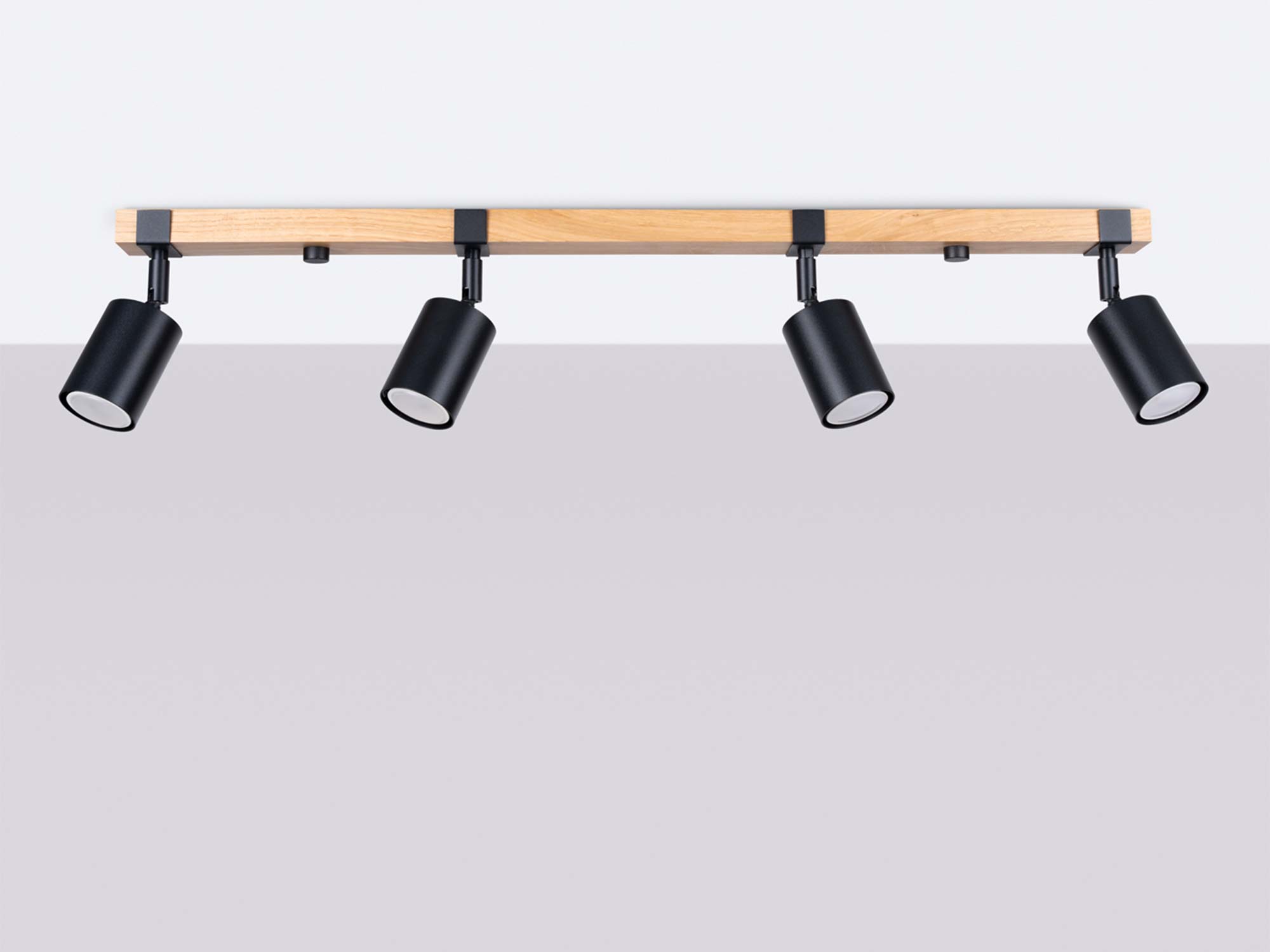 Listwa sufitowa czteropunktowa z drewnianą belką i czarnymi reflektorami