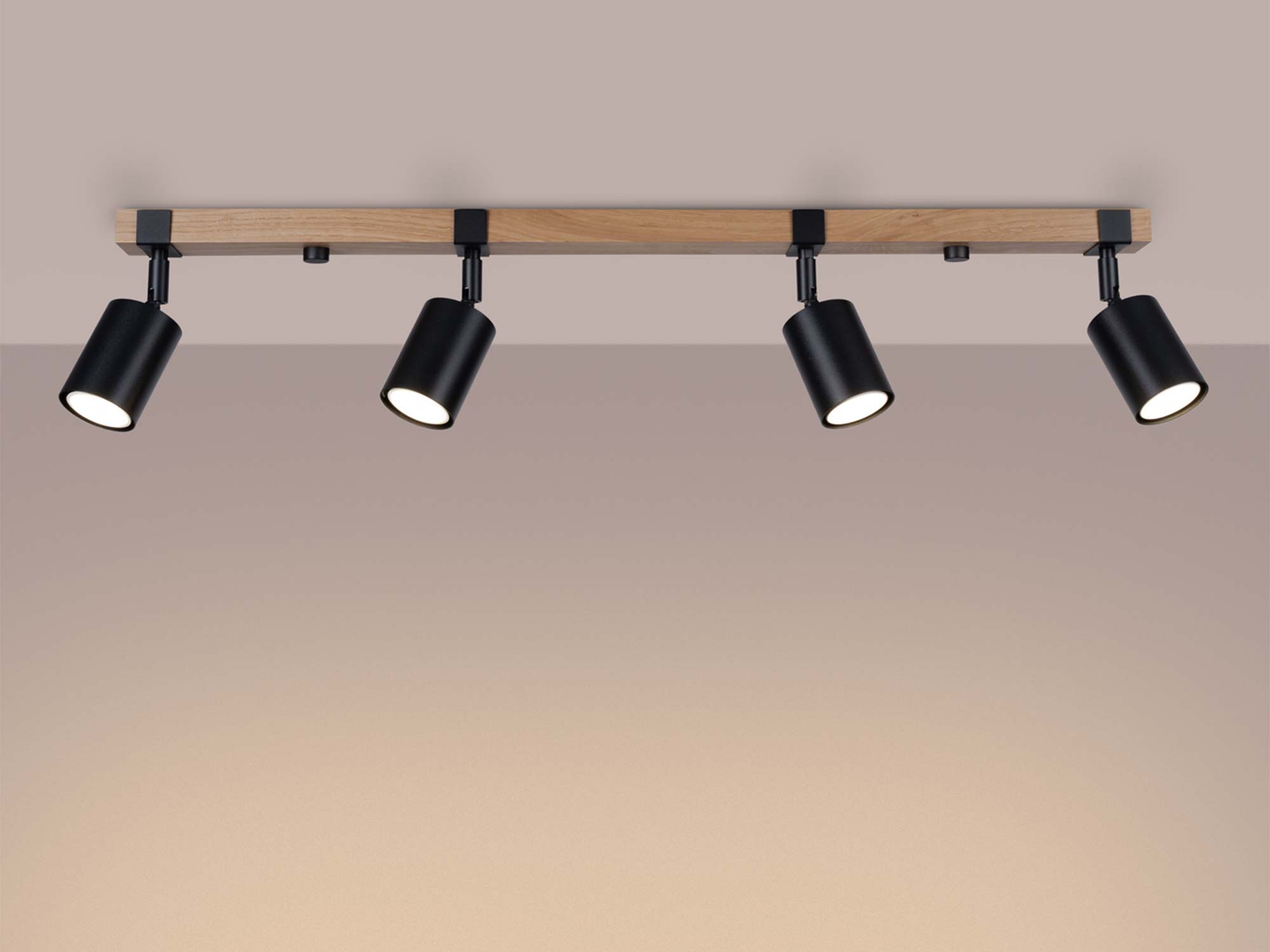 Czteropunktowa lampa sufitowa z drewnem i czarnymi spotami świecąca