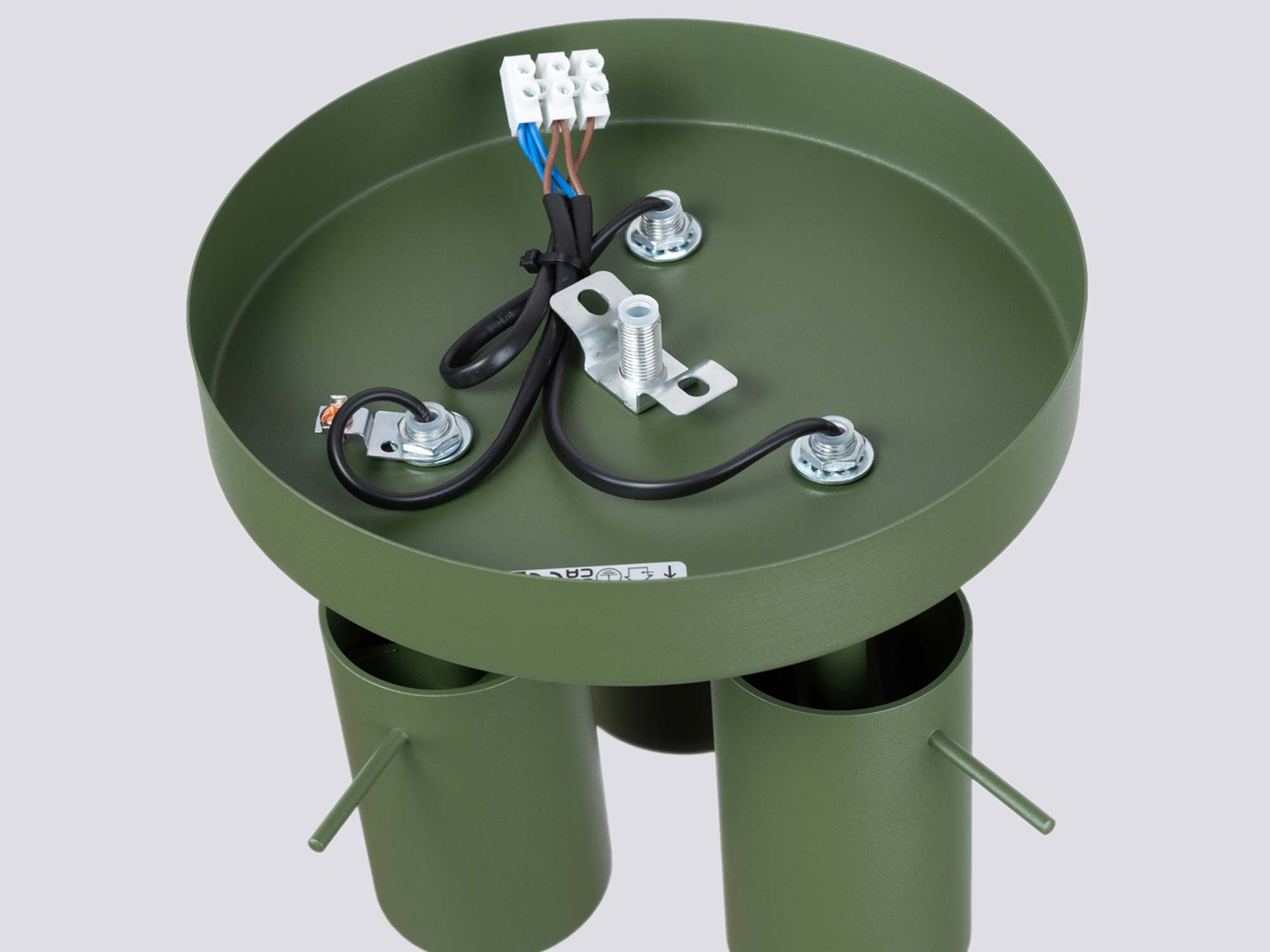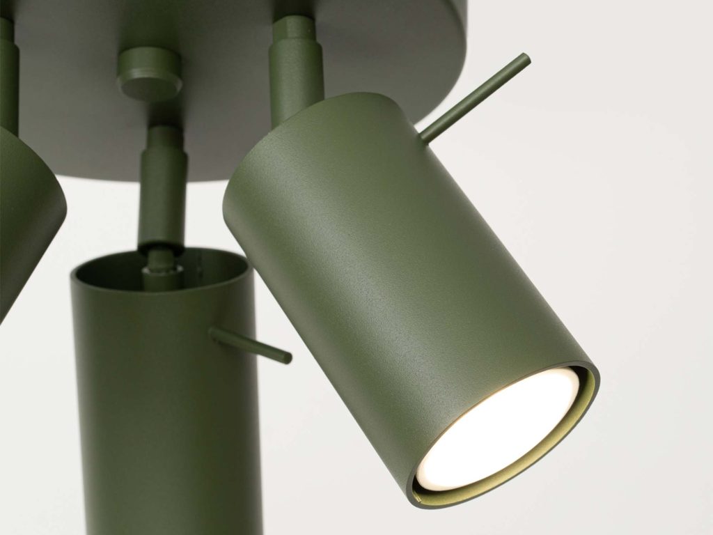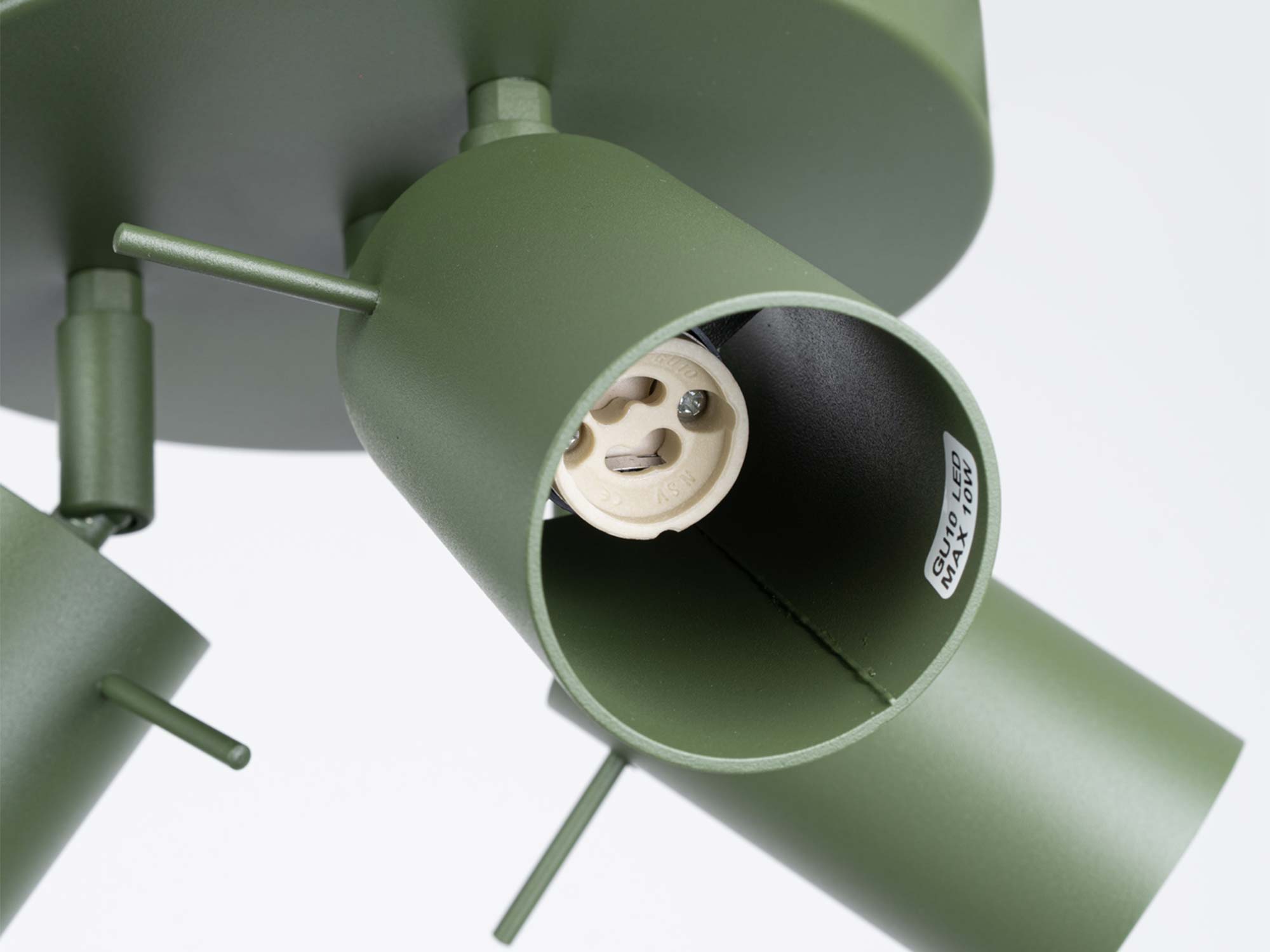 Stalowa konstrukcja gwarantuje trwałość, a matowe wykończenie w kolorze oliwkowej zieleni dodaje lampie unikalnego charakteru. Ten modny odcień świetnie komponuje się z naturalnym drewnem, bielą, szarością czy beżem, co czyni plafon uniwersalnym rozwiązaniem do różnych aranżacji – od skandynawskich po nowoczesne i loftowe.