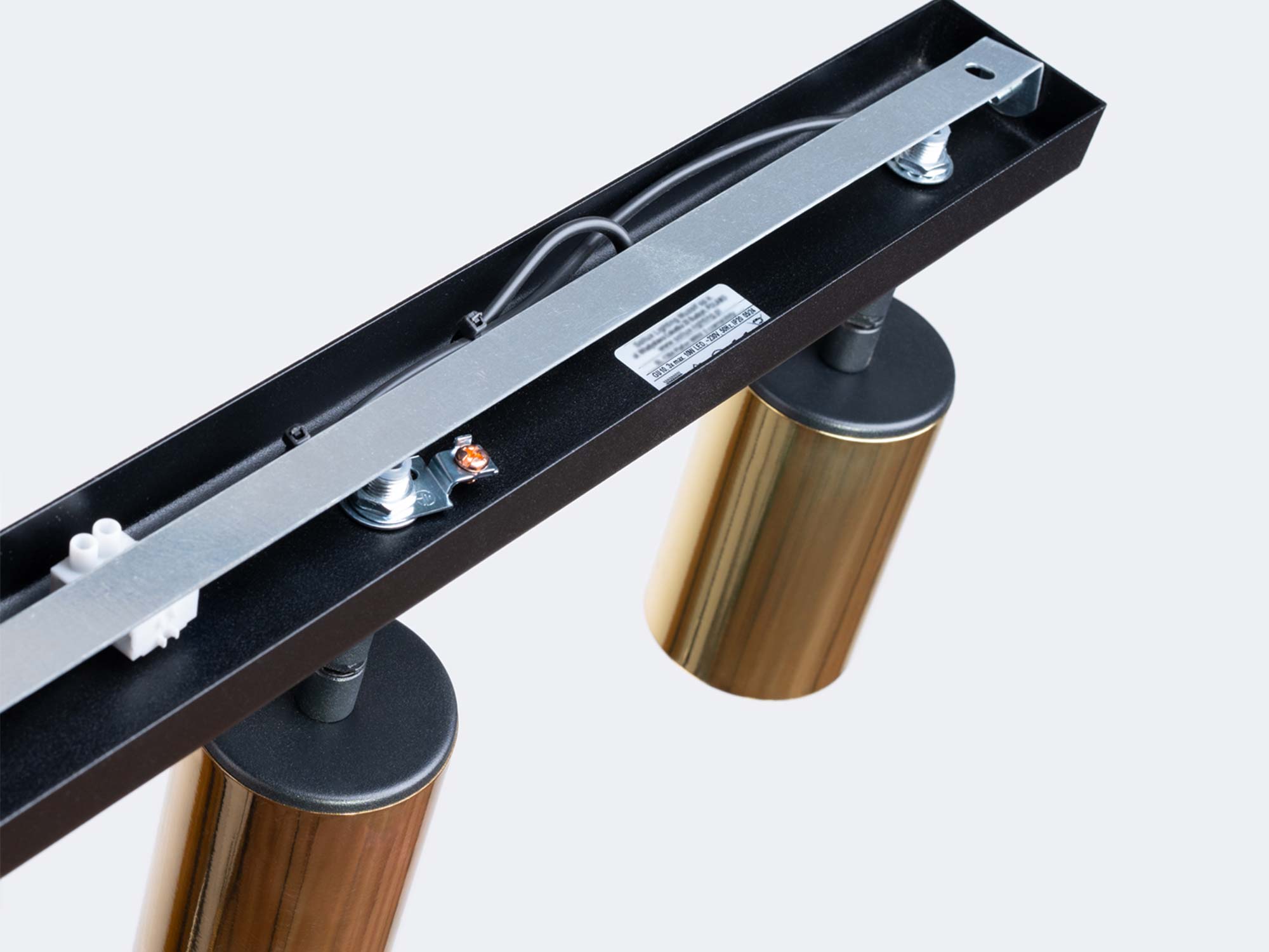 Detal dwóch złotych reflektorów cylindrycznych plafonu sufitowego zbliżenie