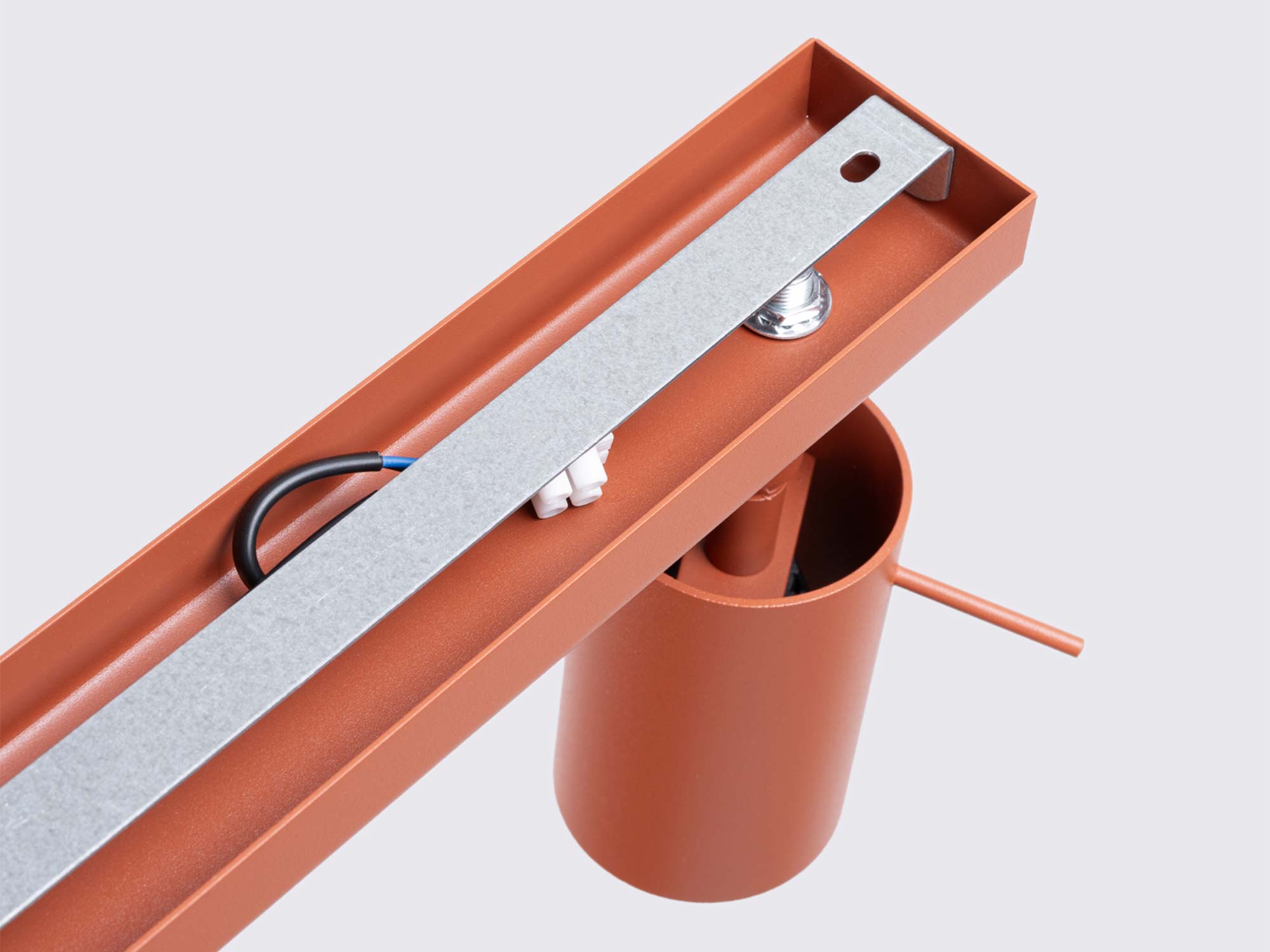 Kolor ochry czerwonej przełamuje schematy klasycznych opraw w bieli czy czerni. To barwa energetyczna, odważna, a jednocześnie elegancka – świetnie komponuje się z wnętrzami loftowymi, nowoczesnymi i eklektycznymi. Stalowa konstrukcja zapewnia stabilność, a subtelne detale wykończenia podkreślają designerski charakter lampy.