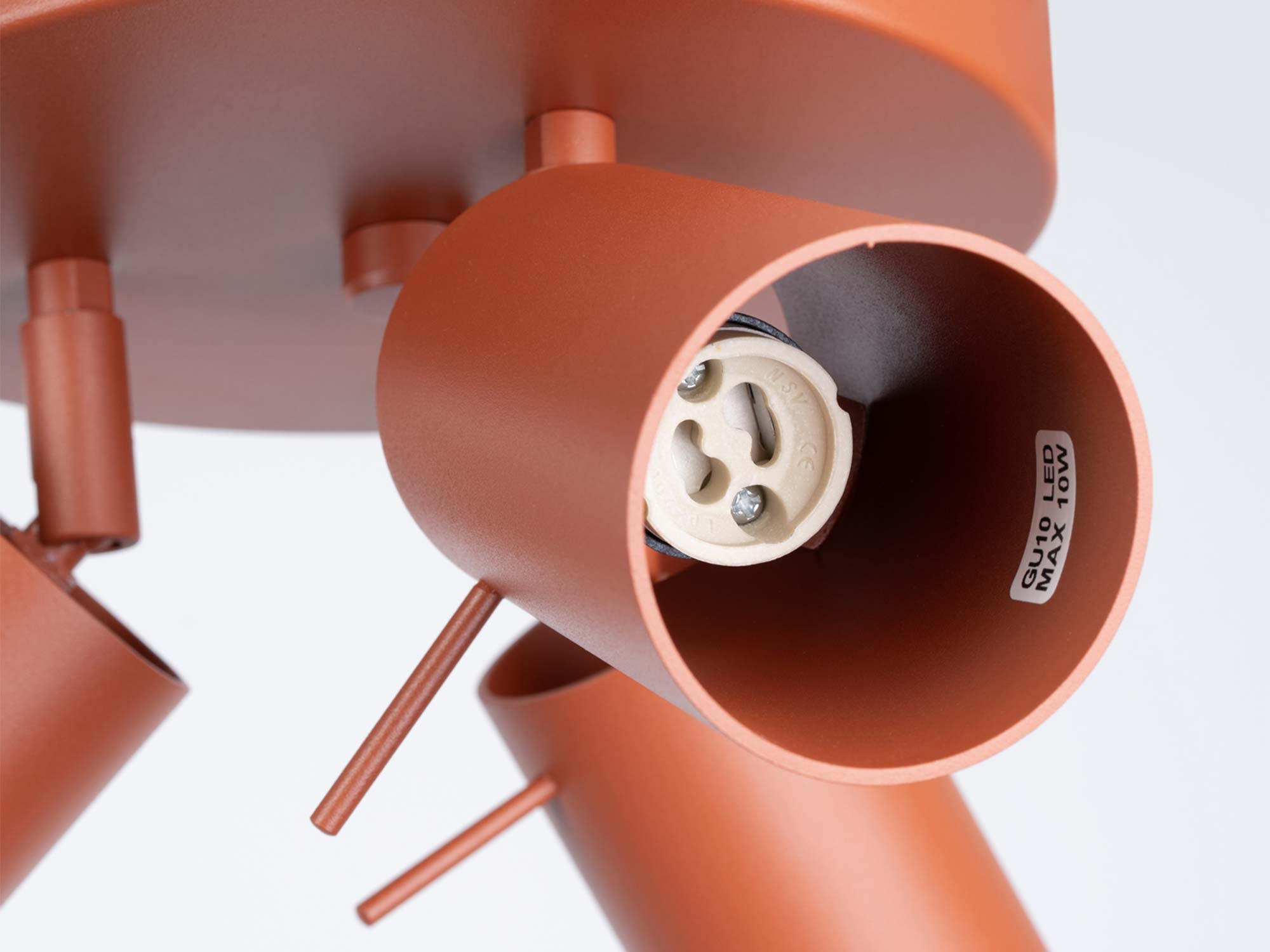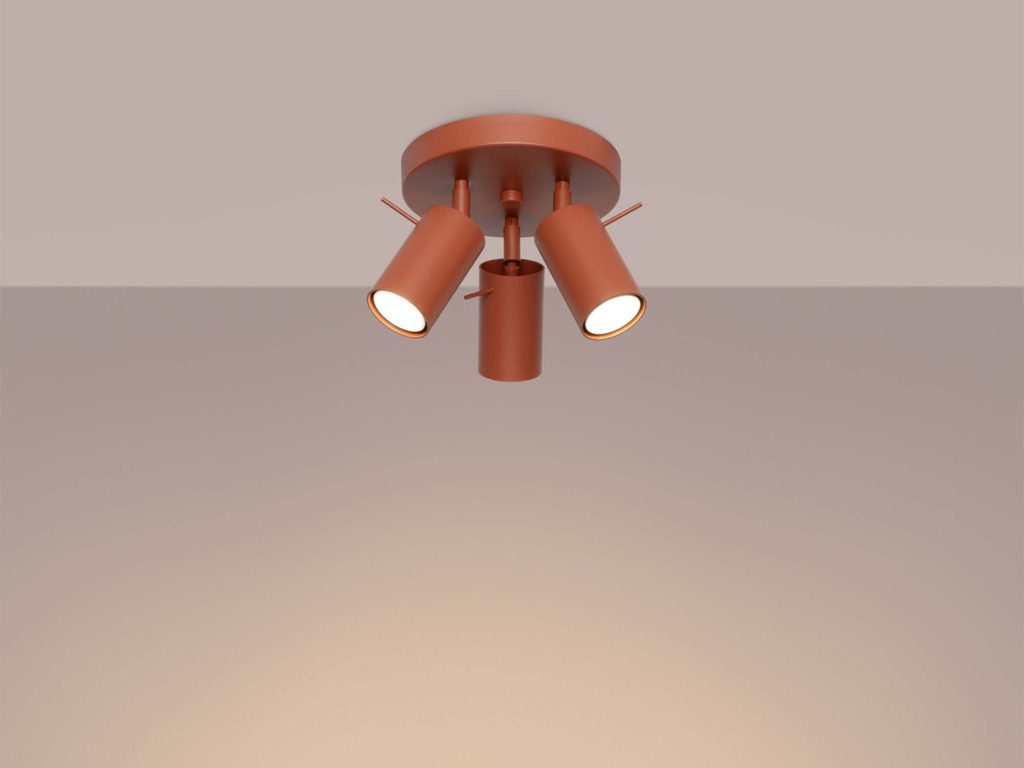 Plafon RINTO 3P ochra czerwona to niezwykle stylowe oświetlenie sufitowe, które łączy nowoczesny minimalizm z odważnym akcentem kolorystycznym. Trzy źródła światła GU10 zapewniają mocny, równomierny blask, a oryginalna konstrukcja z trzema reflektorami rozmieszczonymi na planie trójkąta sprawia, że plafon doskonale nadaje się do wyeksponowania różnych stref w pomieszczeniu.