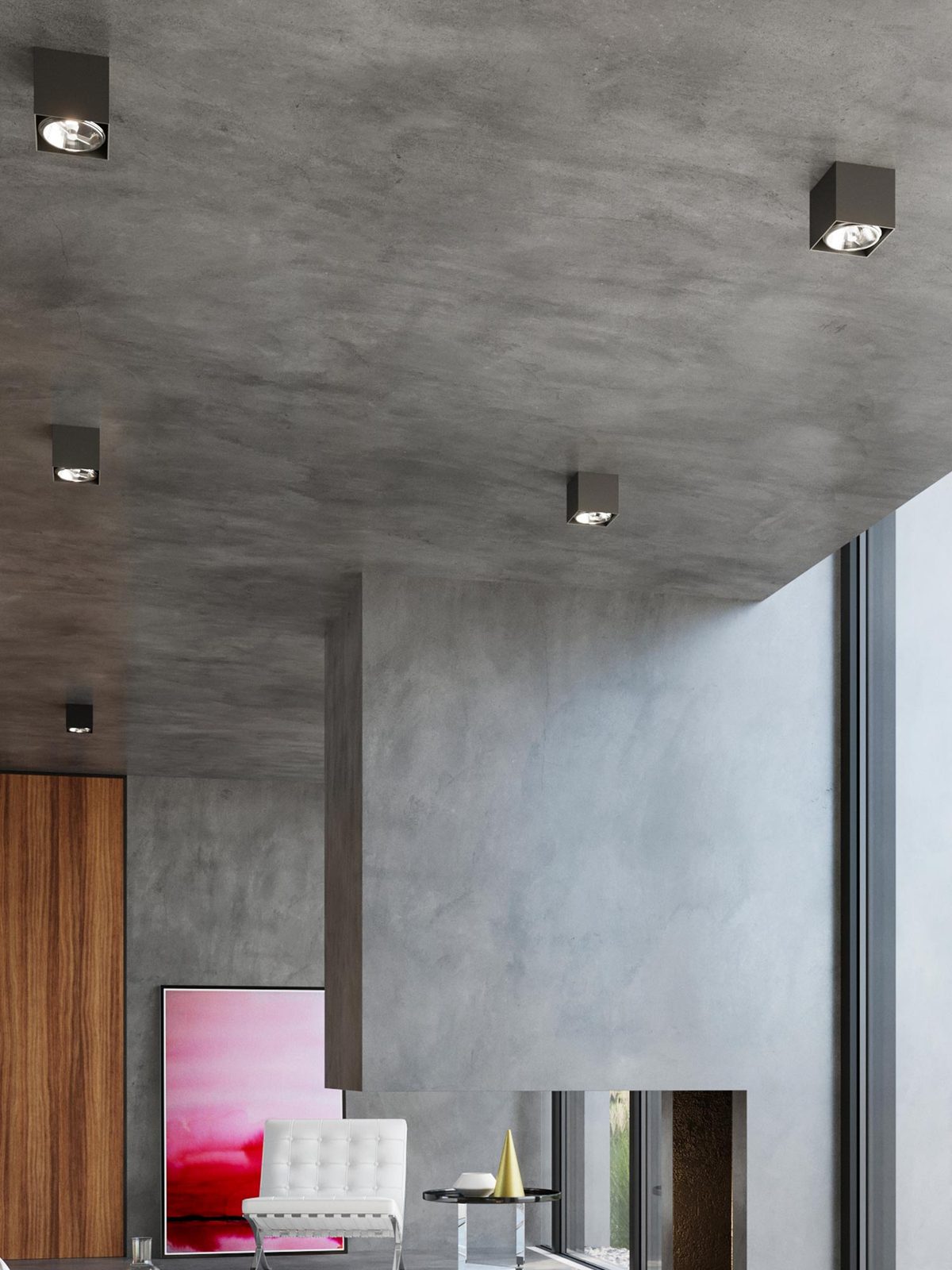 Czarne oprawy punktowe LED w nowoczesnym suficie betonowym
