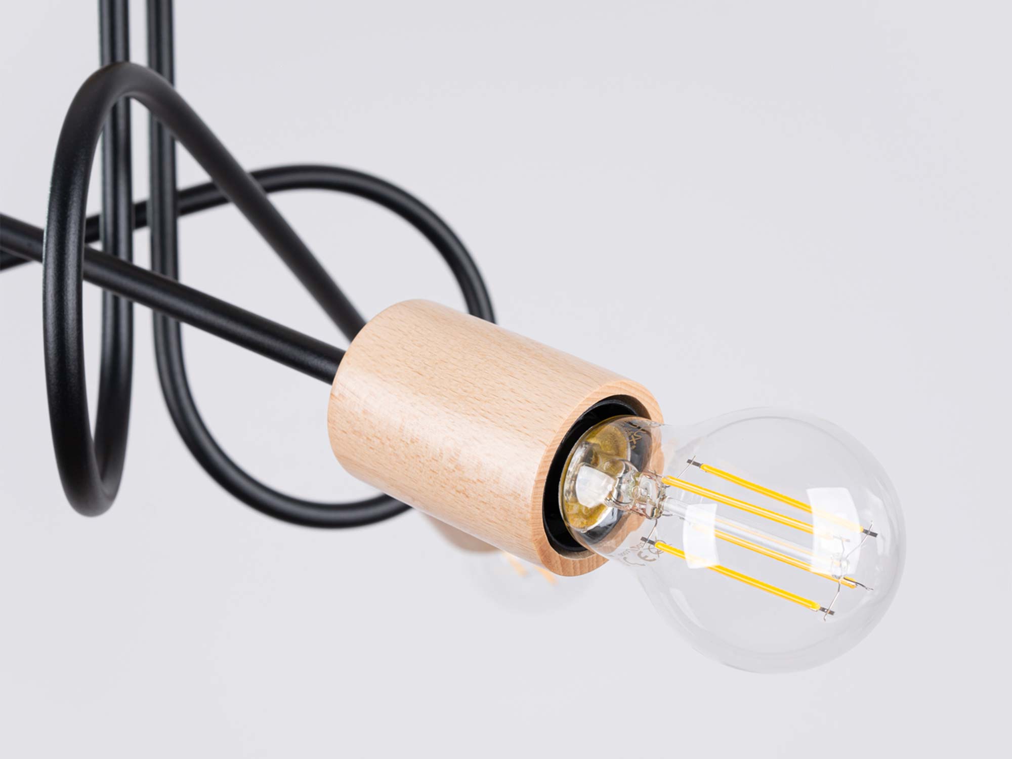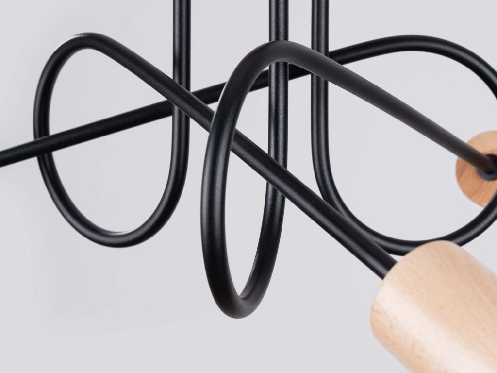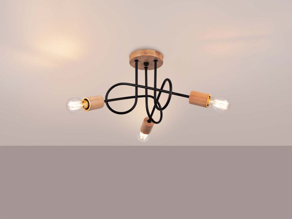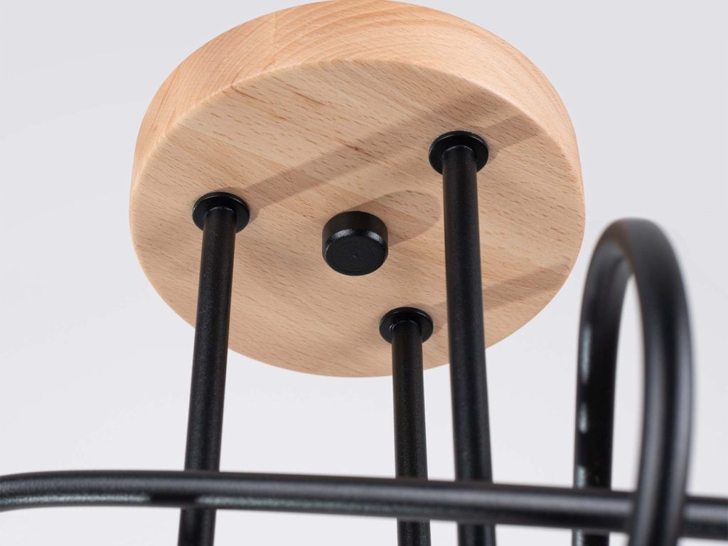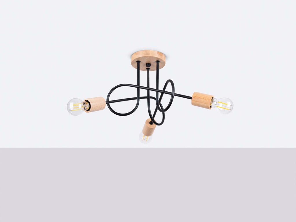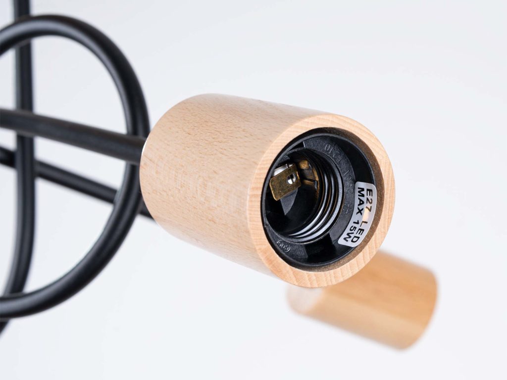 Lampa została wykonana z połączenia solidnej stali oraz naturalnego drewna, co nadaje jej trwałości i unikalnego charakteru. Dzięki trzem punktom światła opartym na popularnym gwincie E27, żyrandol zapewnia doskonałe oświetlenie przestrzeni – od salonu i jadalni, po sypialnię czy przestrzeń biurową.