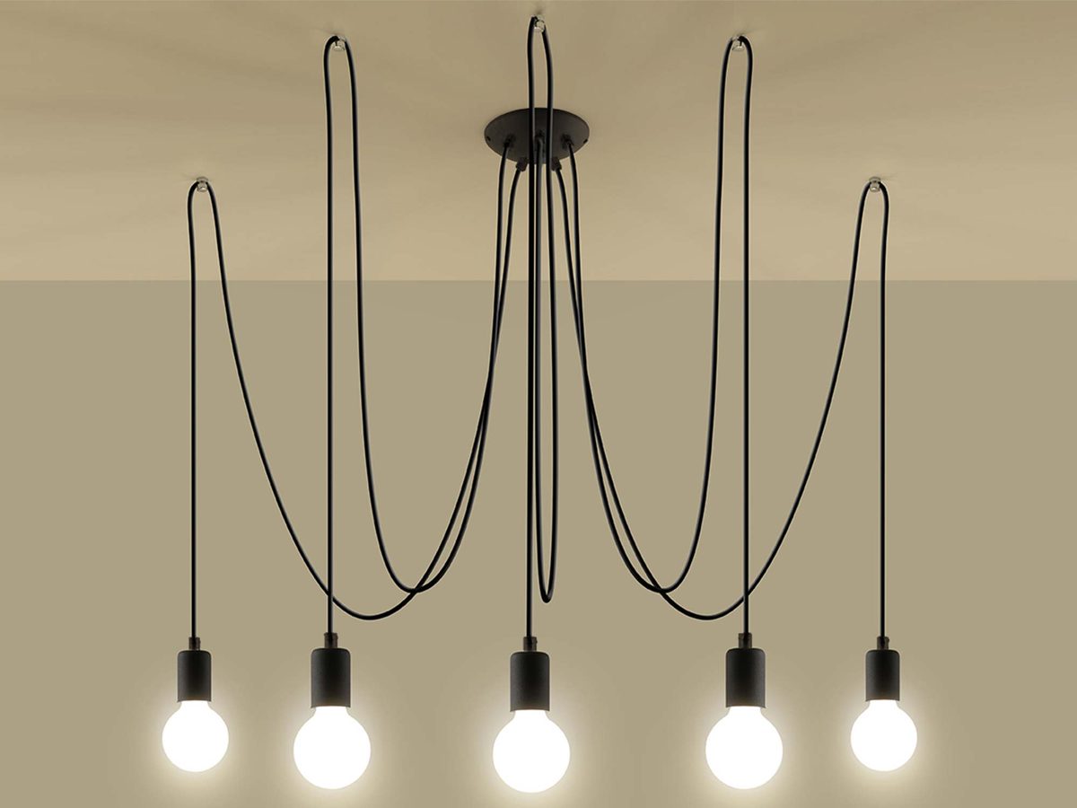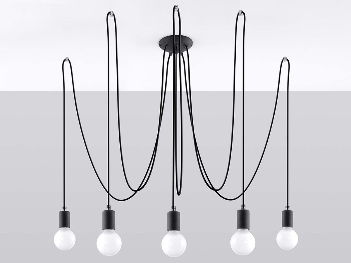 Design żyrandolu NOLAN 5 stanowi ciekawy pomysł na designerskie oświetlenie wnętrza. Surowe oprawy lamp rozwieszane na czarnych kablach w oplocie, które są mocowane do sufitu, oświetlają każdy kąt pomieszczenia, nadając mu unikalny charakter. Ten model jest dedykowany dla osób ceniących niepowtarzalność i indywidualizm we wnętrzach.