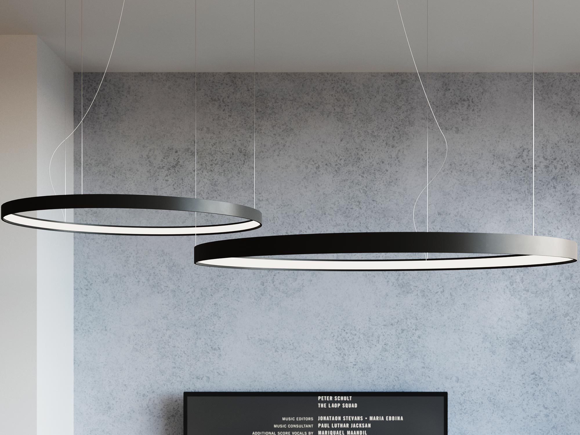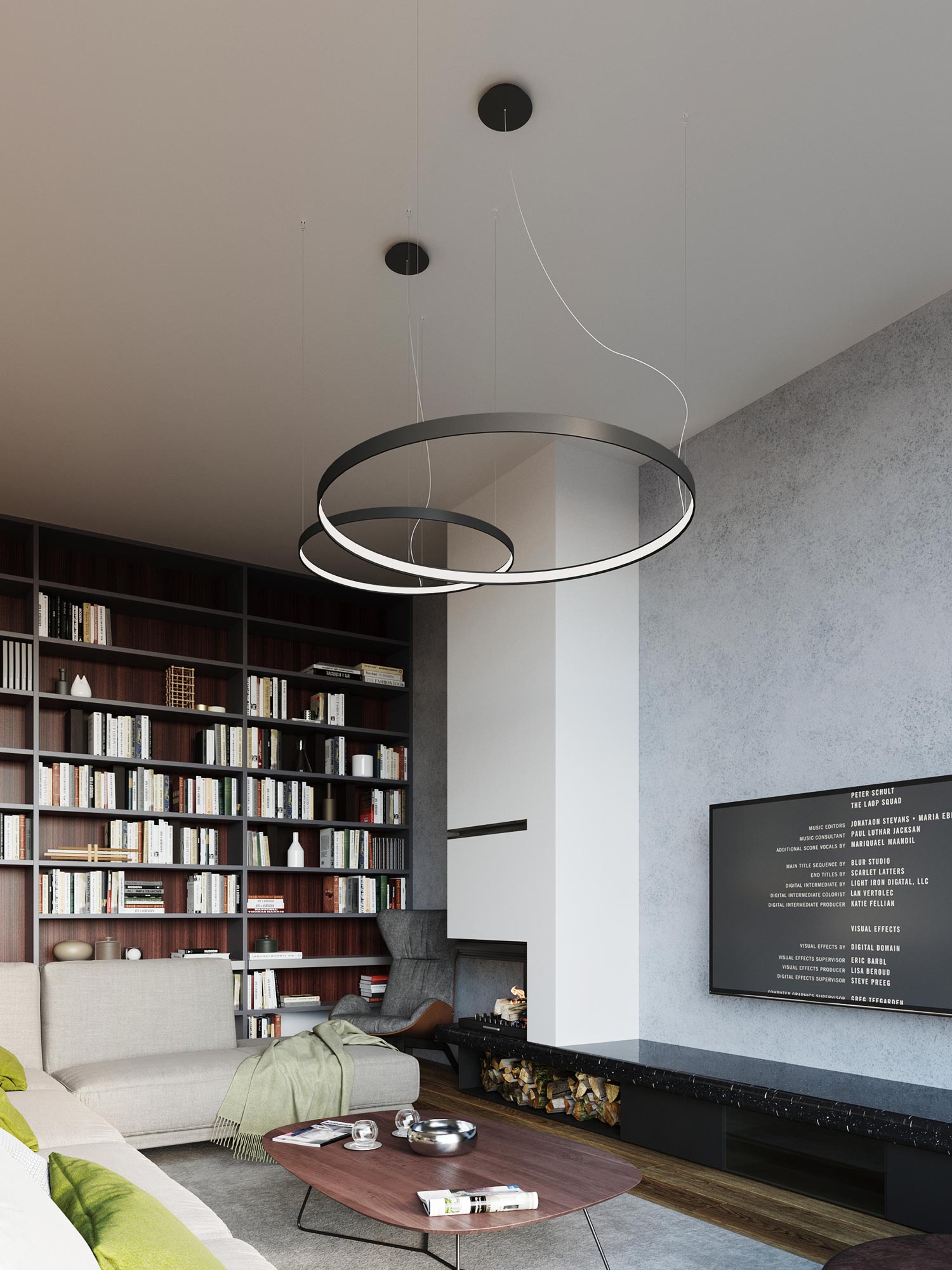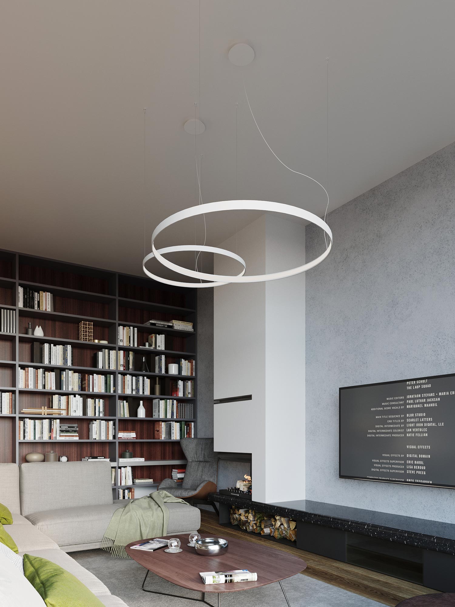 Designerska lampa LED nad eleganckim salonem w stylu loftowym