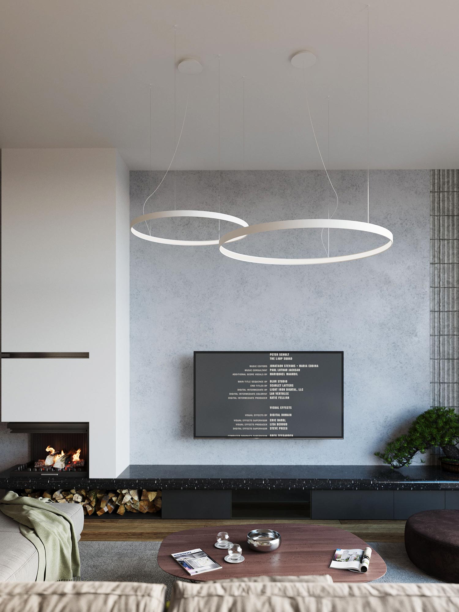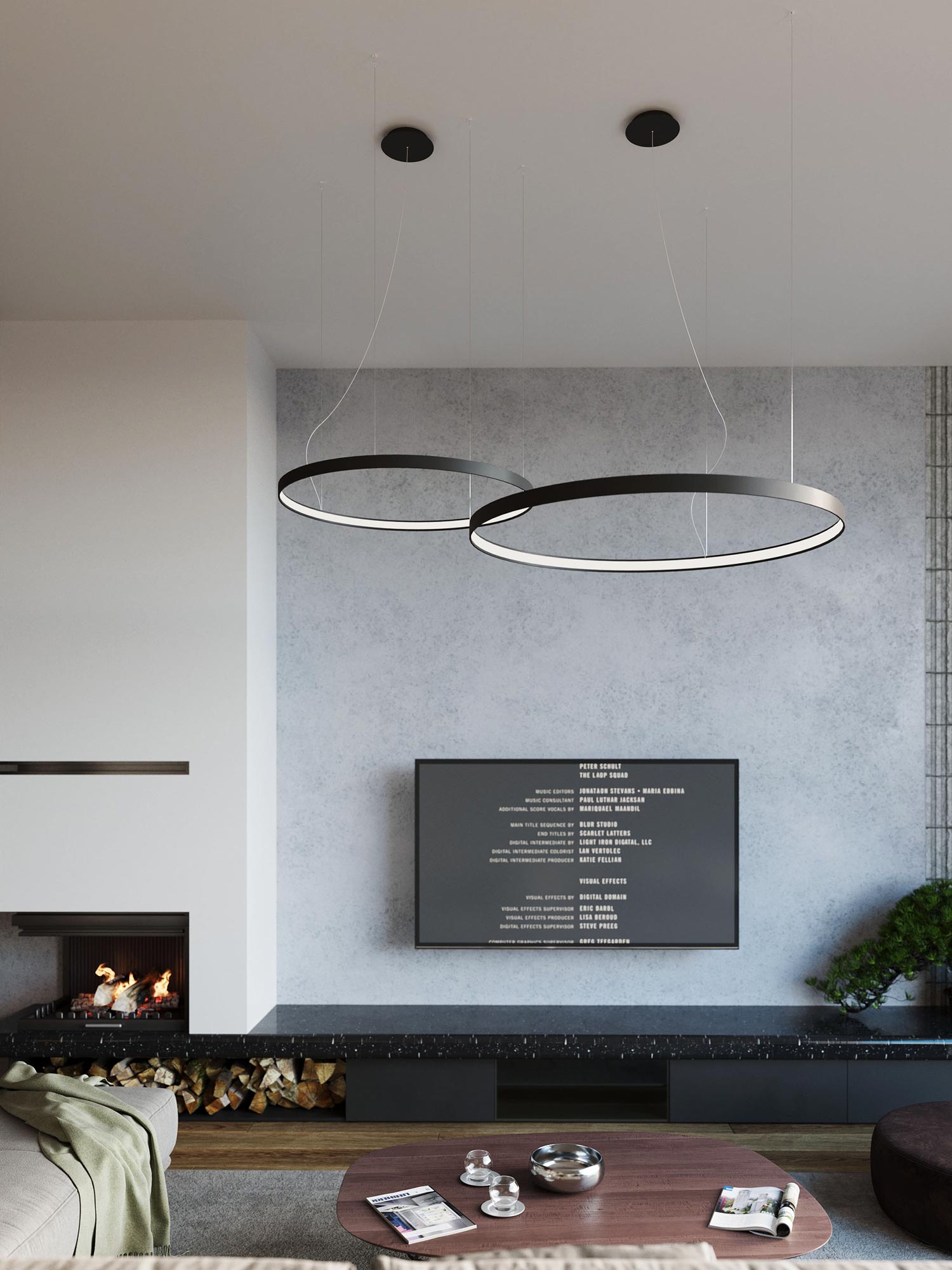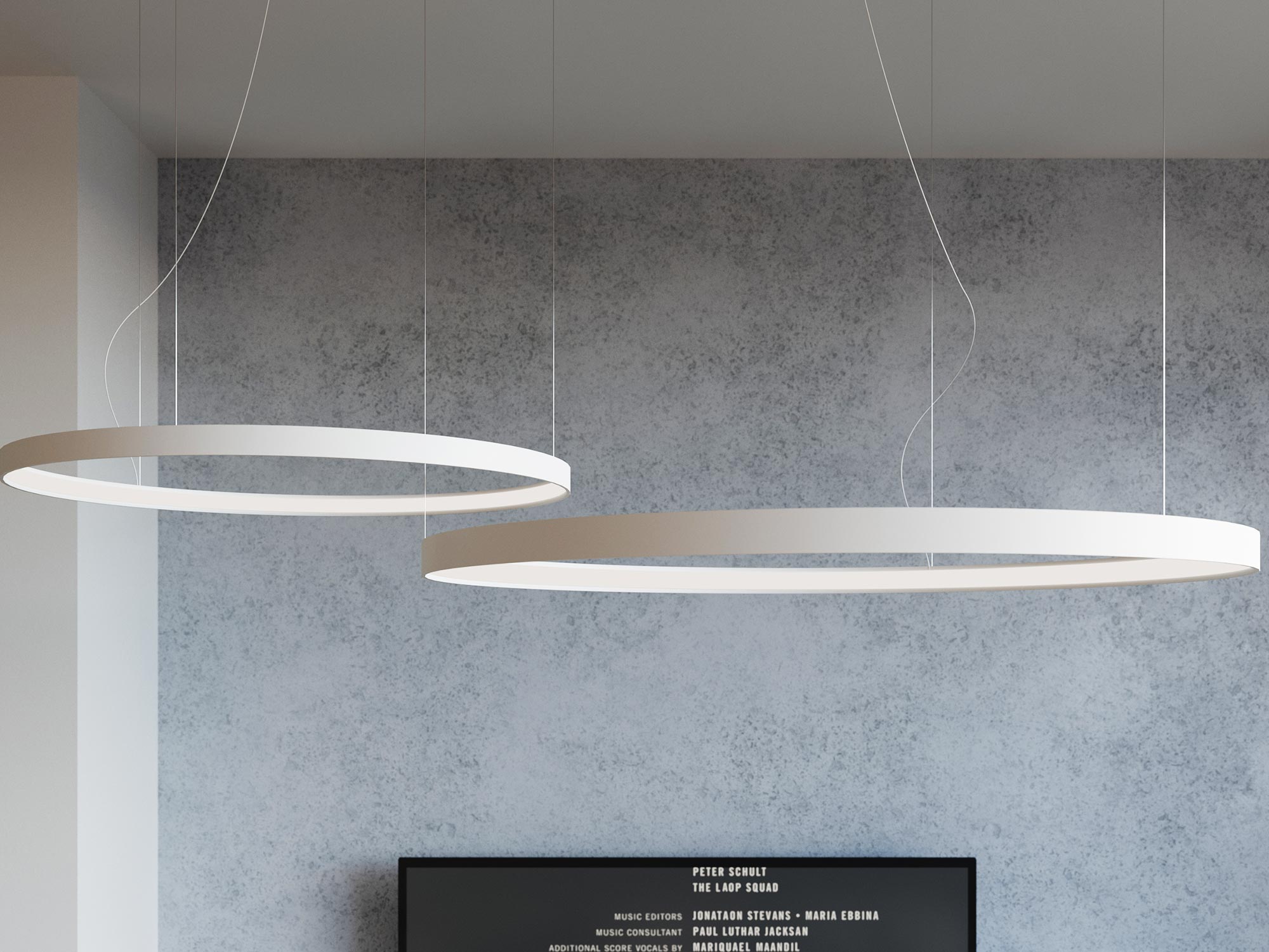 Designerska lampa LED nad eleganckim salonem w stylu loftowym