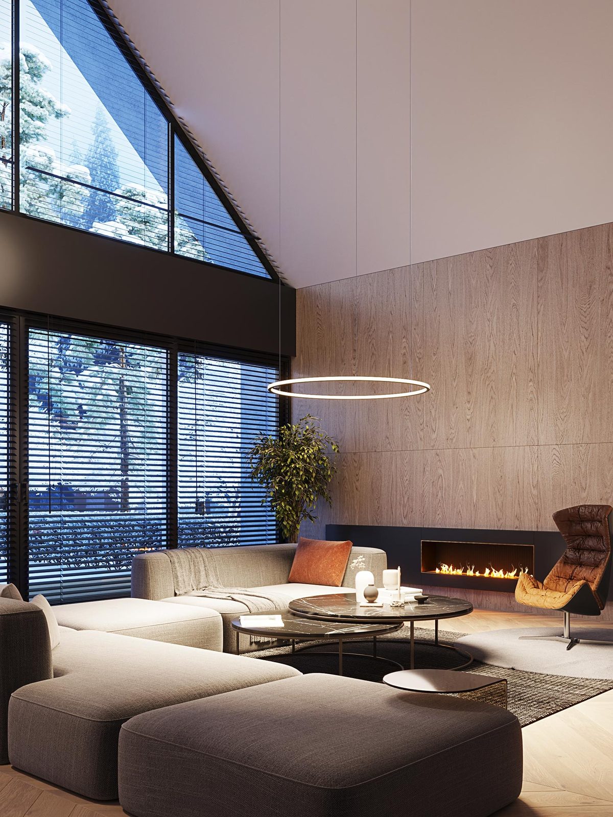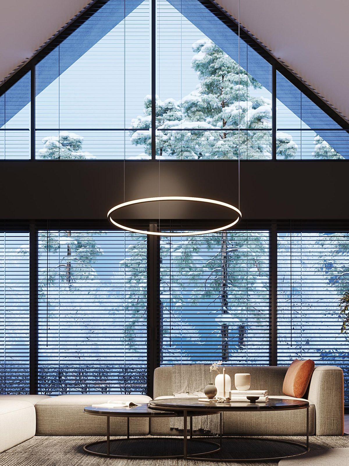 Salon z panoramicznymi szybami i zawieszoną lampą LED czarno-białą
