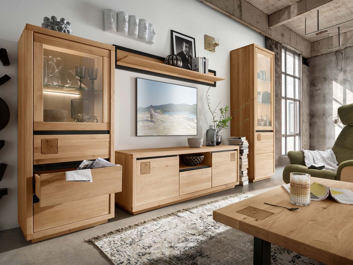 Drewniana szafka RTV z witryną i półką w nowoczesnym wnętrzu
