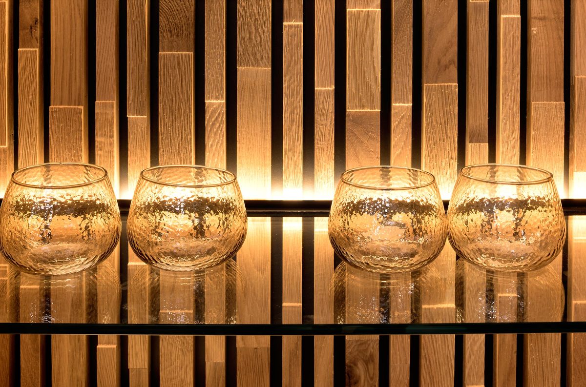 - Oświetlenie: Barwa ciepła, zamocowane na półkach szklanych oświetlające ścianę tylną
