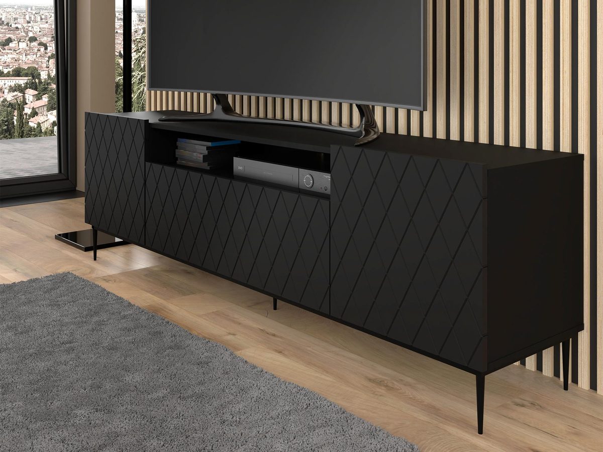 Elegancka Szafka RTV 190 cm Bellagio do Salonu to doskonały wybór dla osób poszukujących nowoczesnego i stylowego rozwiązania do swojego wnętrza. Ta szafka pod telewizor wyróżnia się atrakcyjnymi zdobionymi frontami oraz eleganckimi metalowymi nogami w formie szpilek, co nadaje jej luksusowego charakteru. Zaprojektowana z myślą o najwyższej jakości i funkcjonalności, szafka Bellagio oferuje dużą pojemność dzięki trzem zamkniętym półkom oraz jednej otwartej.