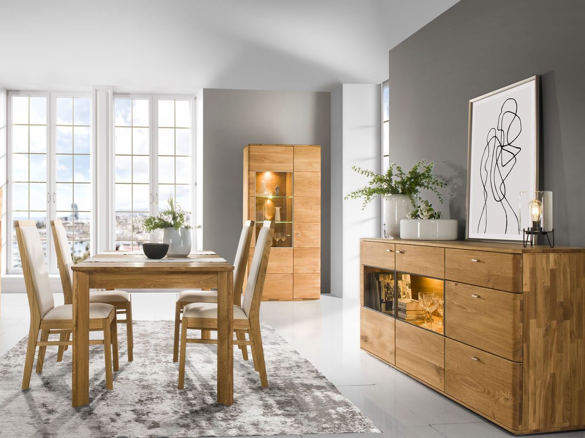 Wyjątkowa Komoda Duża do Salonu Maseri to który wyróżnia się niebywałą funkcjonalnością, a przy tym doskonałym wyglądem. Mebel ten podzielony został na część przeszkloną oraz zabudowaną. Zastosowane dekoracyjne przeszklenie w drzwiczkach to świetny sposób na wyeksponowanie rożnego rodzaju dekoracji czy eleganckiej zastawy stołowej. Natomiast w drugiej części znajdują się bardzo funkcjonalne i pakowne szuflady. Bez wątpienia główny atut tego mebla stanowi użycie do jego produkcji litego drewna dębowego. Jest ono gwarancją solidności i niebywałej trwałości, a przy tym świetnie się prezentuje i nadaje każdemu wnętrzu ciepła i przytulności.