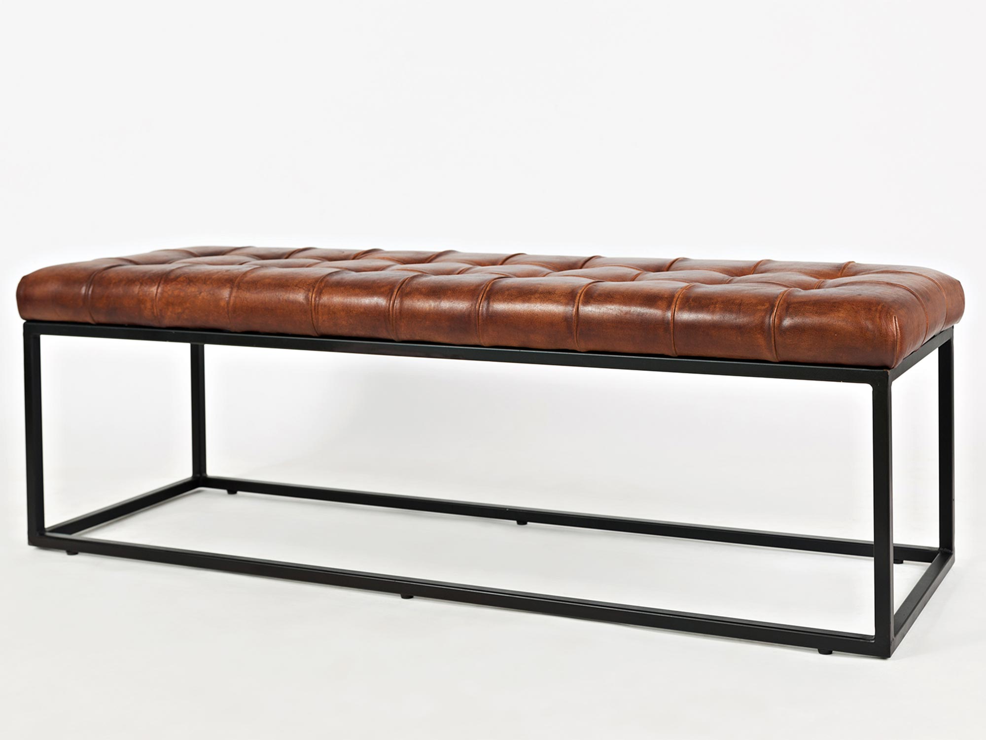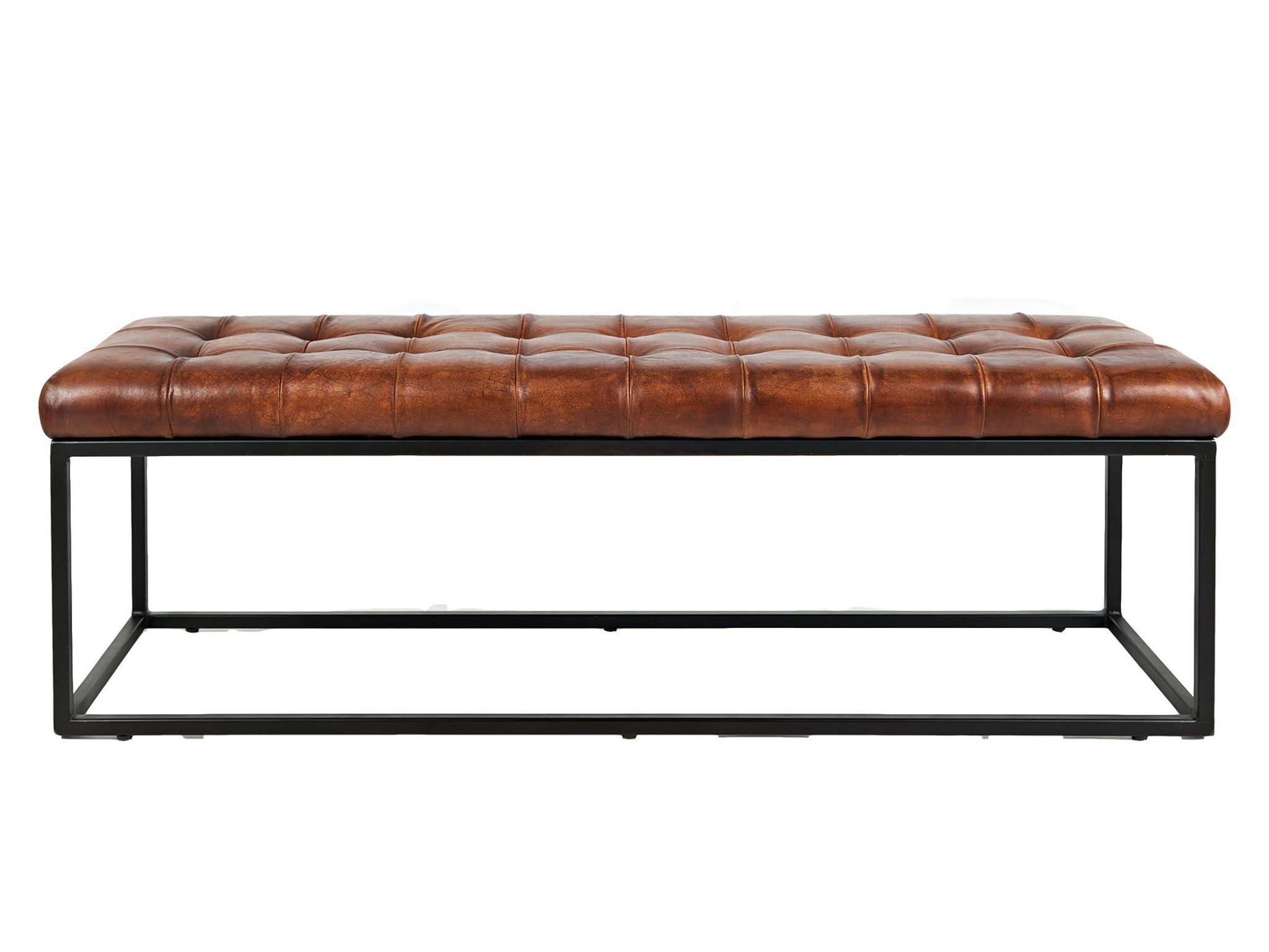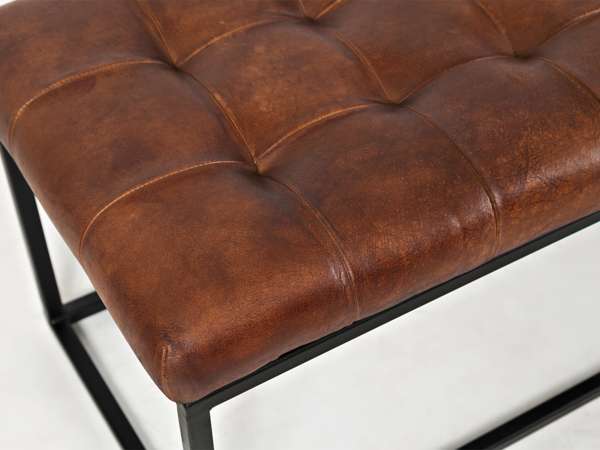 Ławka z pikowanym siedziskiem z naturalnej skóry w kolorze rdzawo-brązowym oraz czarnym stelażem w stylu industrialnym.