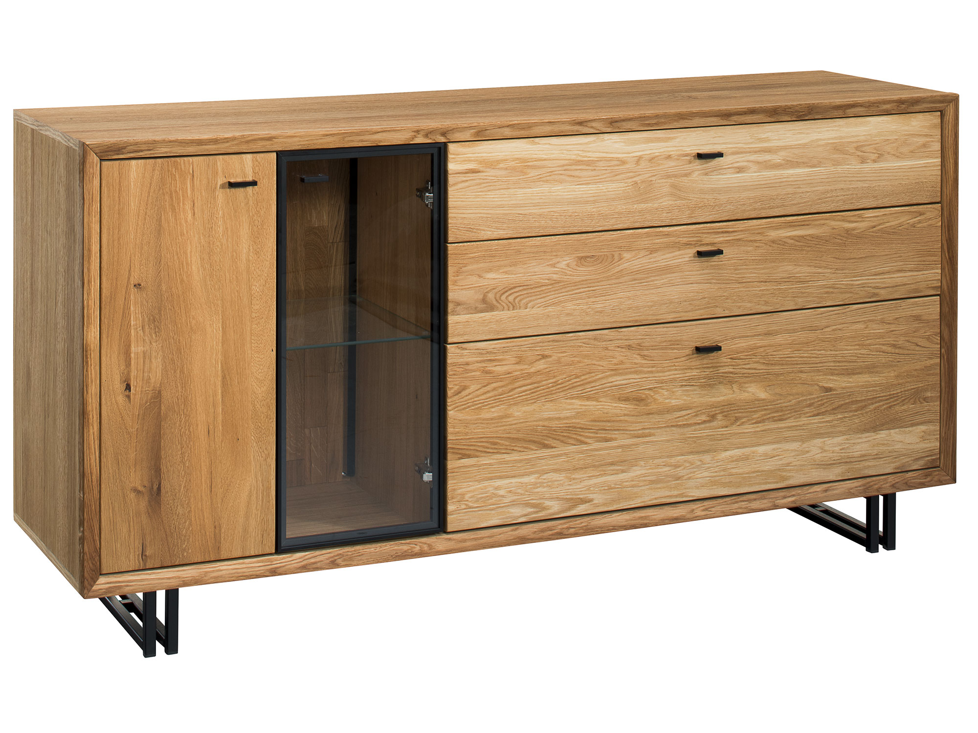 Gustowna i nowomodna komoda Toledo do pokoju zrobiona z litego drewna dębowego najlepszego gatunku z fornirowanymi detalami idealnie dopasuje się do każdego wnętrza niejednej jadalni czy salonu. Stateczna konstrukcja oraz gustowne i awangardowe wykończenie sprawią, że drewniana komoda do salonu fenomenalnie uatrakcyjni każde wnętrze. Toledo posiada funkcjonalne drzwiczki, klapę i bardzo praktyczną szufladę, a także przeszkloną cześć, która wyeksponuje każdą dekorację.