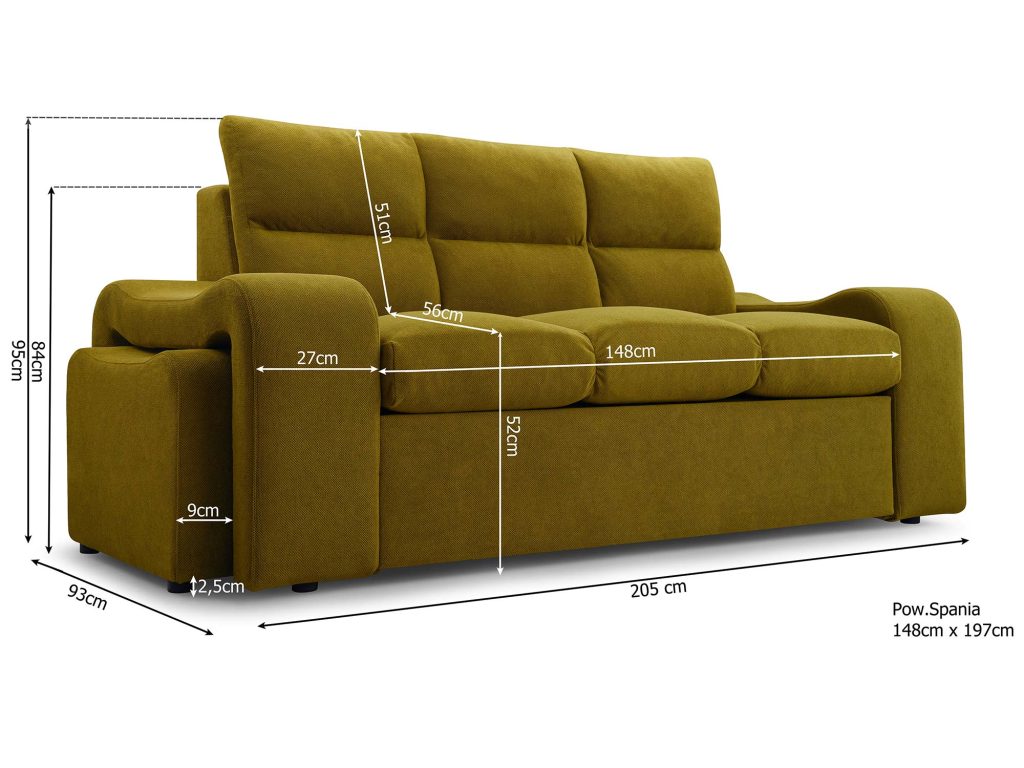 Sofa została wyposażona w wygodny mechanizm rozkładania typu wózek, który umożliwia szybkie przekształcenie kanapy w przestronne łóżko o powierzchni 148 × 197 cm. To rozwiązanie idealne dla osób, które często goszczą rodzinę i znajomych lub potrzebują dodatkowego miejsca do spania w swoim domu.