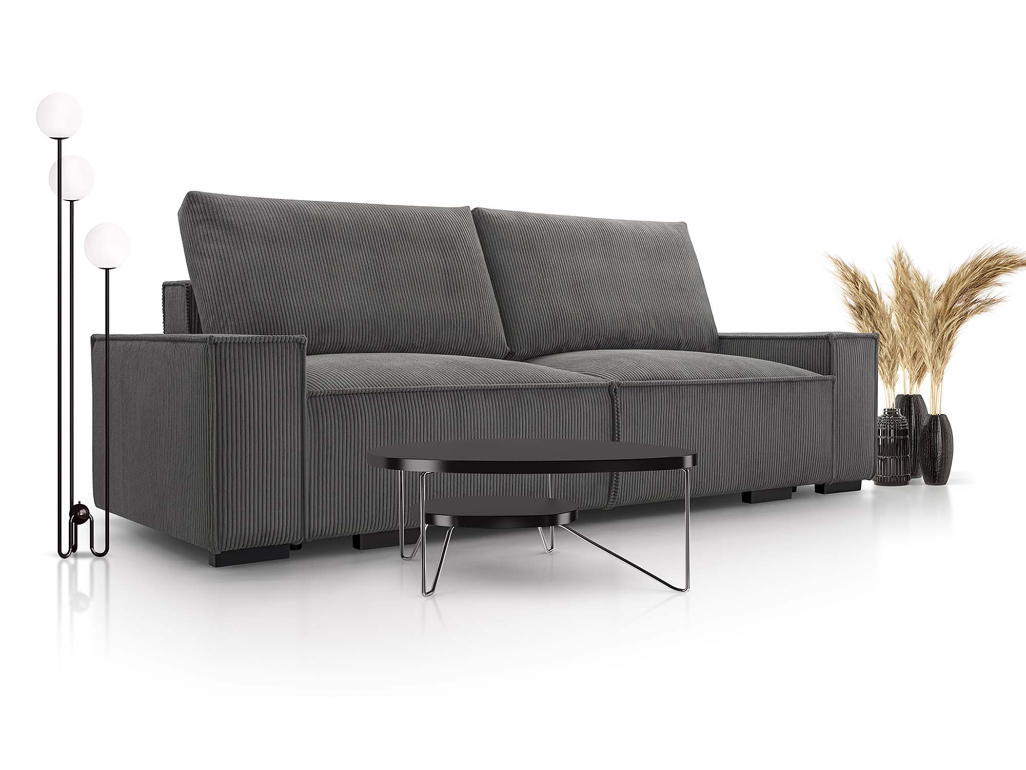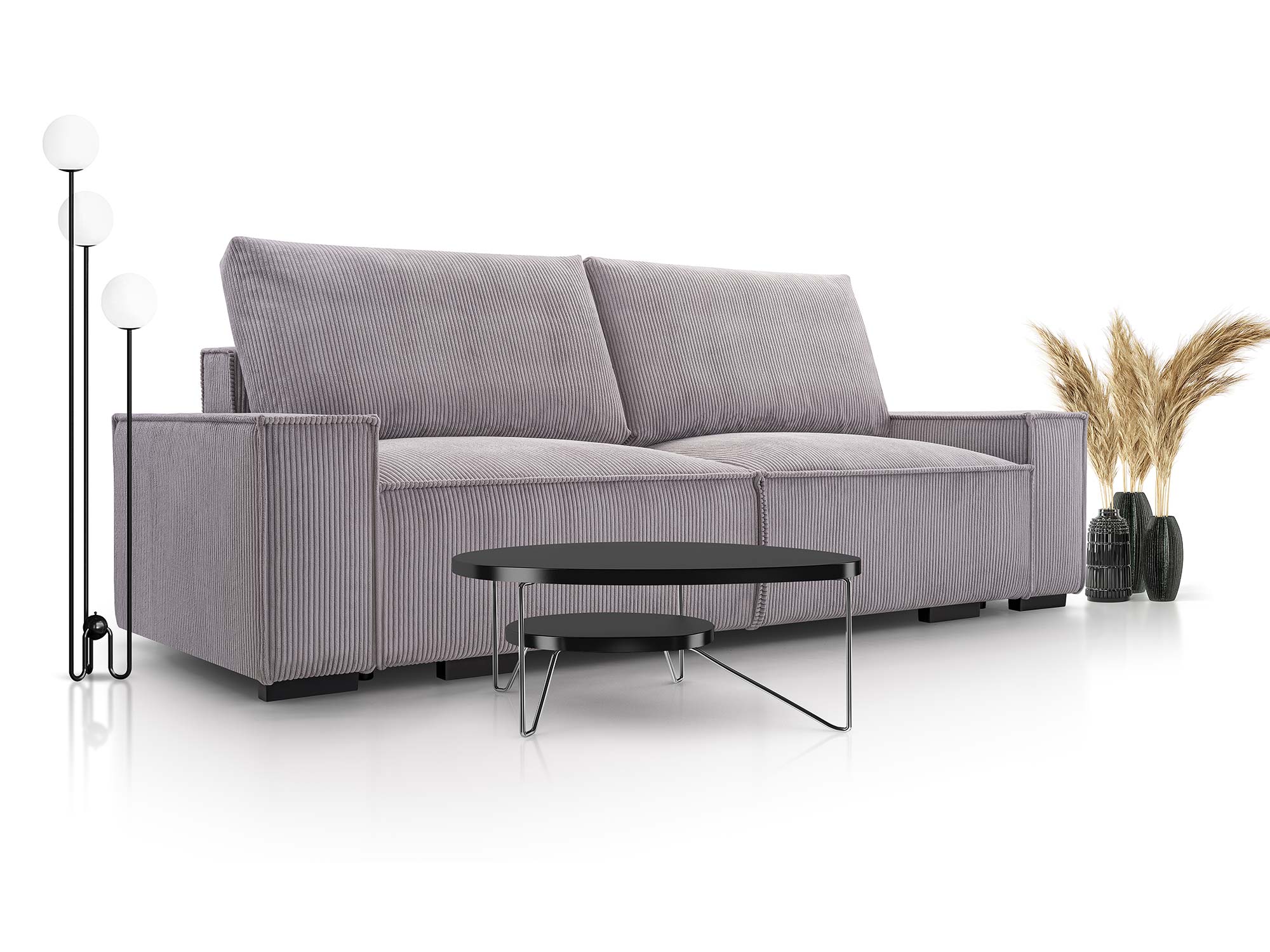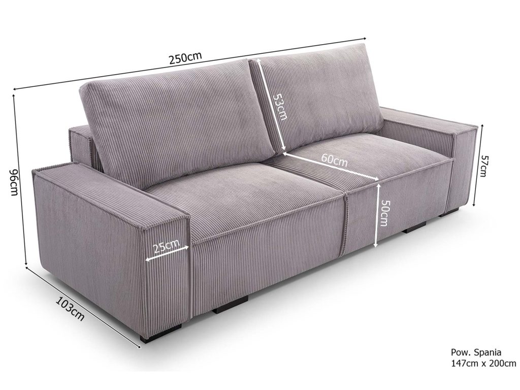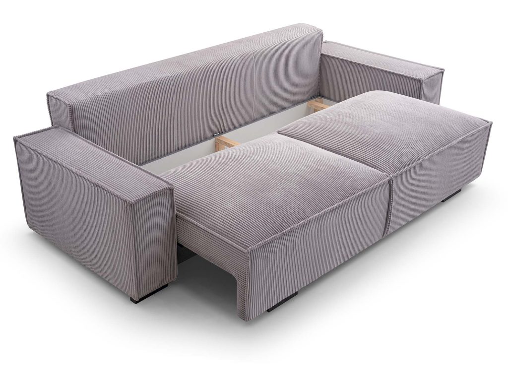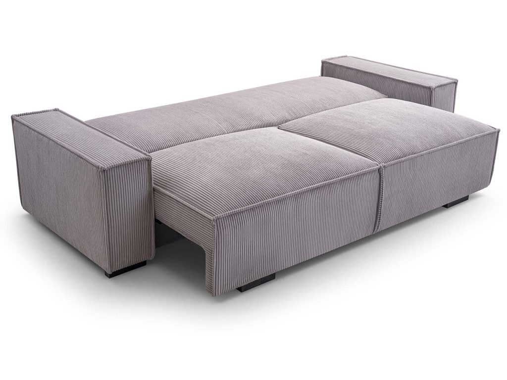Mechanizm rozkładania typu DL umożliwia szybkie i wygodne przekształcenie kanapy w pełnowymiarowe łóżko o powierzchni spania 147 × 200 cm. Dodatkowy pojemnik na pościel pozwala przechowywać koce, poduszki i kołdry, dzięki czemu przestrzeń w salonie pozostaje uporządkowana. Nóżki z czarnego plastiku, mocowane na śrubach, stabilizują konstrukcję, a jednocześnie nadają jej lekkości.