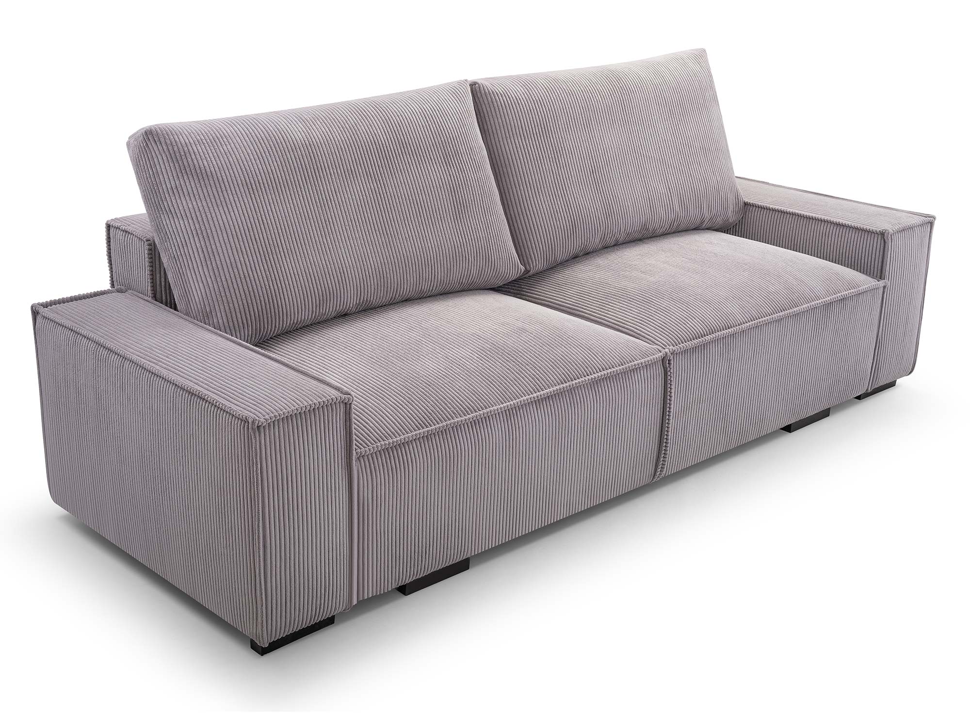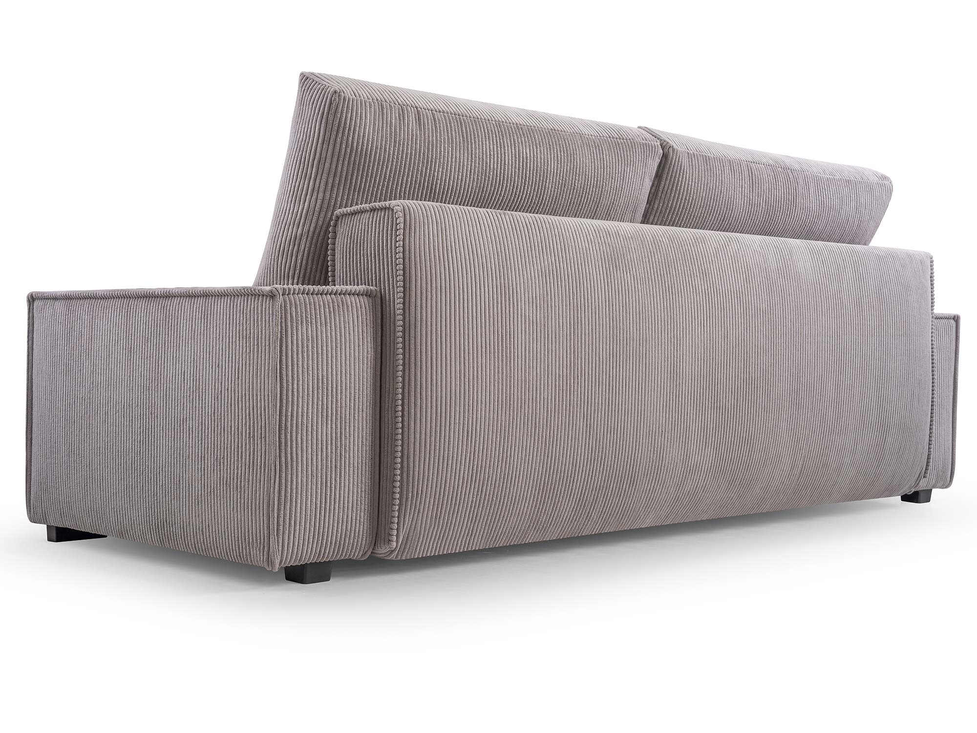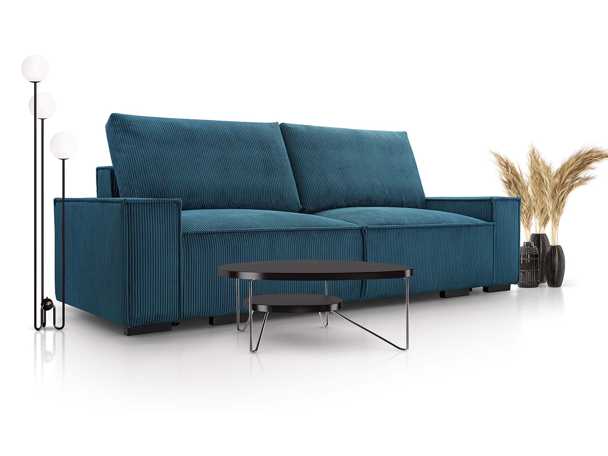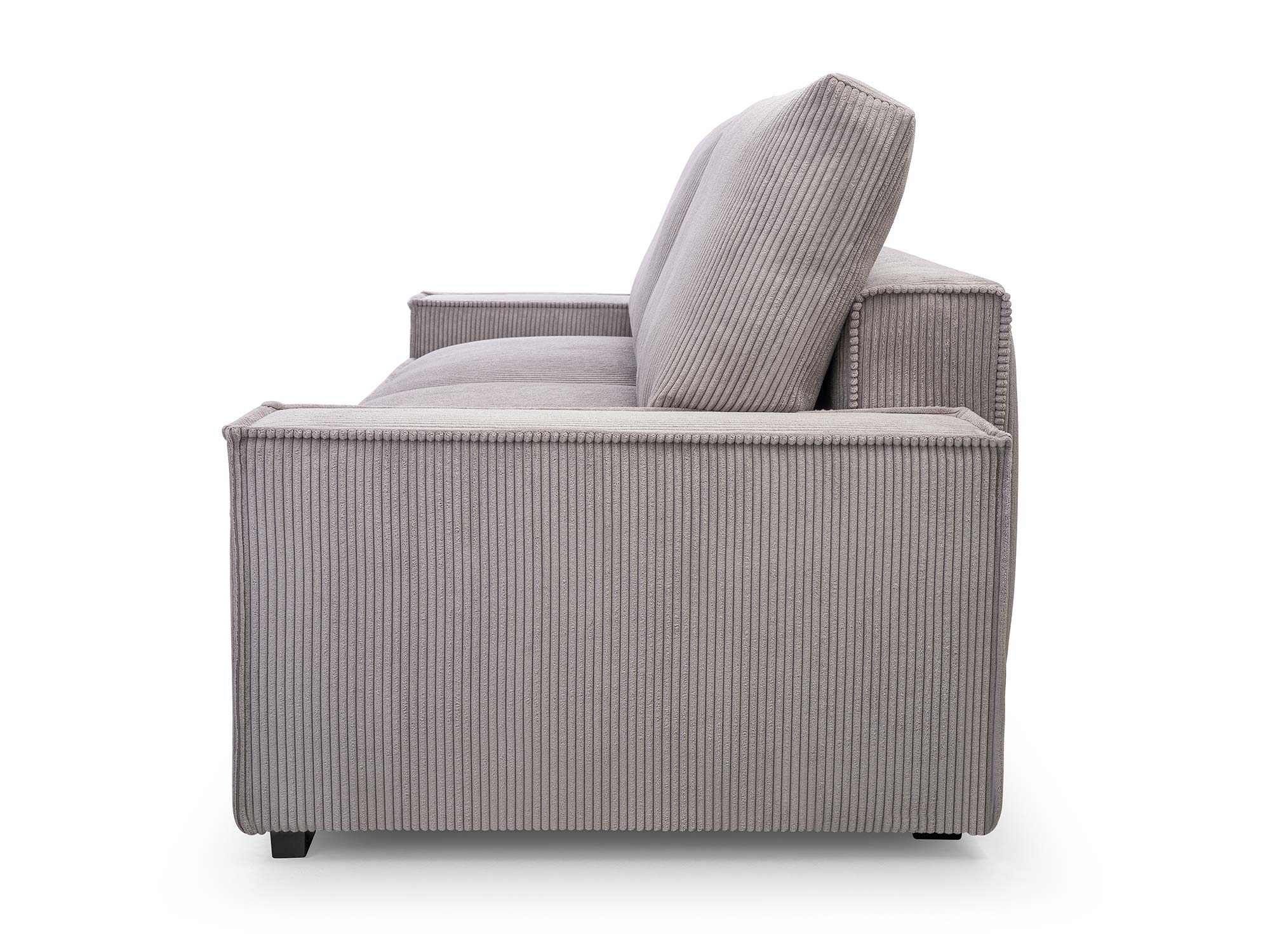 Mechanizm rozkładania typu DL umożliwia szybkie i wygodne przekształcenie kanapy w pełnowymiarowe łóżko o powierzchni spania 147 × 200 cm. Dodatkowy pojemnik na pościel pozwala przechowywać koce, poduszki i kołdry, dzięki czemu przestrzeń w salonie pozostaje uporządkowana. Nóżki z czarnego plastiku, mocowane na śrubach, stabilizują konstrukcję, a jednocześnie nadają jej lekkości.